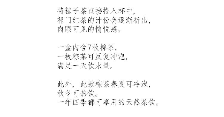 浔隐山粽香茶一盒有7颗,因为祁门红茶的制作工艺跟绿茶不太一样,所以冷水热水皆可泡,春夏冷泡,秋冬热饮,一年四季都可以!而且,送朋友也超好,办公室泡一杯,回头率不要太高!