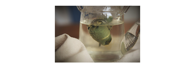 手工做形,卷曲如螺,乌润发亮。干茶紧结。