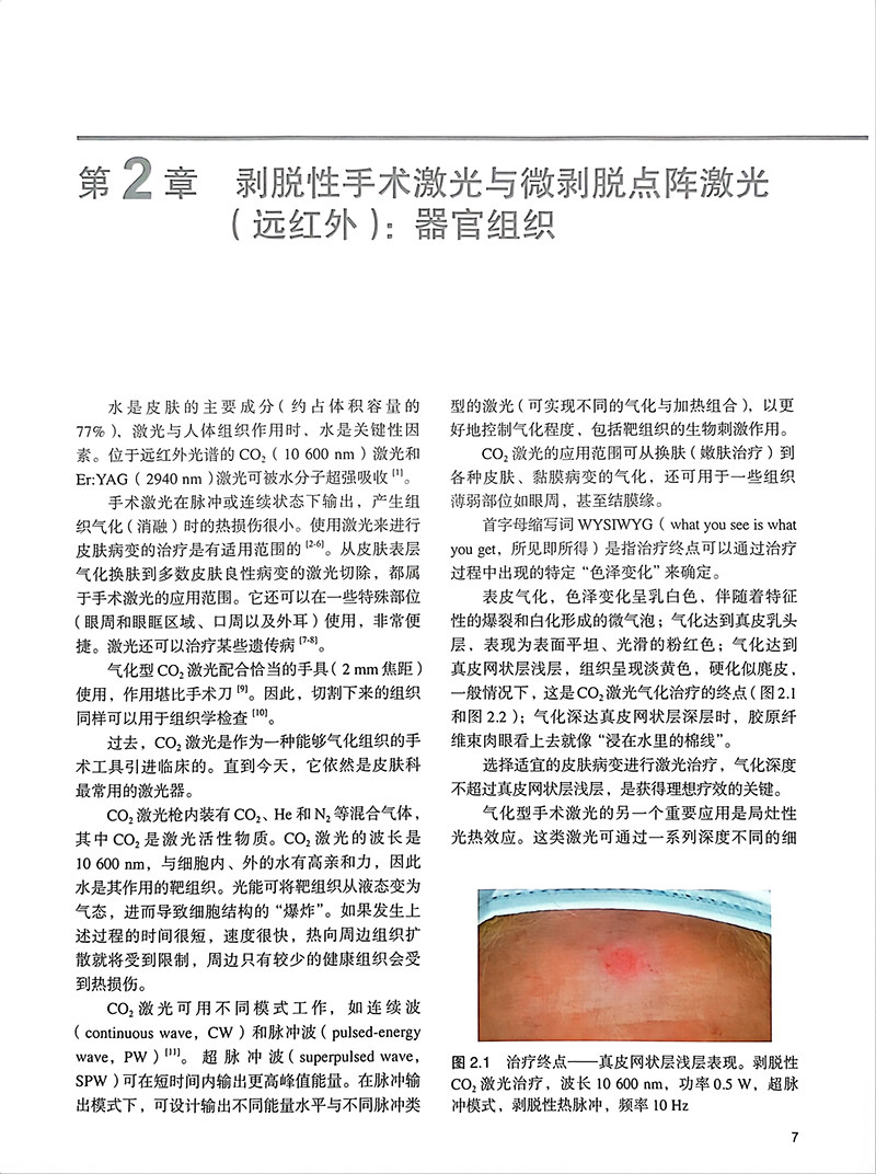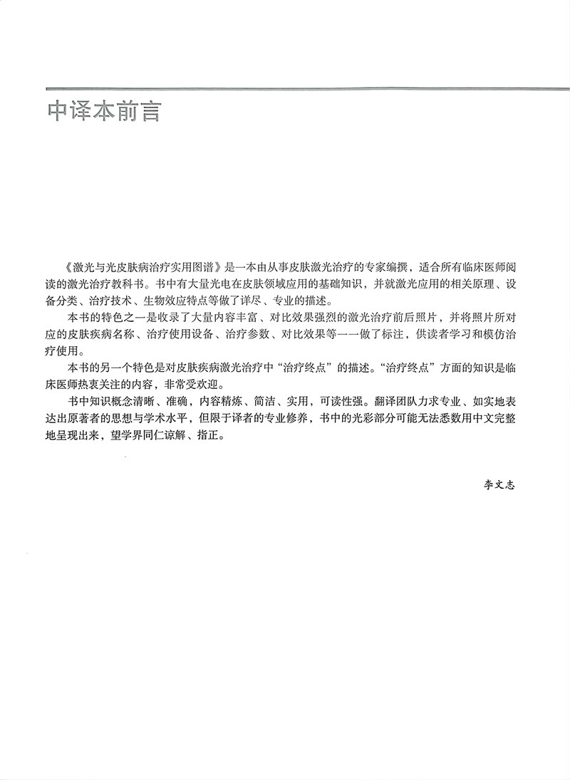 《激光与光皮肤病治疗实用图谱》的另一个特色是对皮肤疾病激光治疗中“治疗终点”的描述。“治疗终点”方面的知识是临床医师热衷关注的内容,非常受欢迎。
