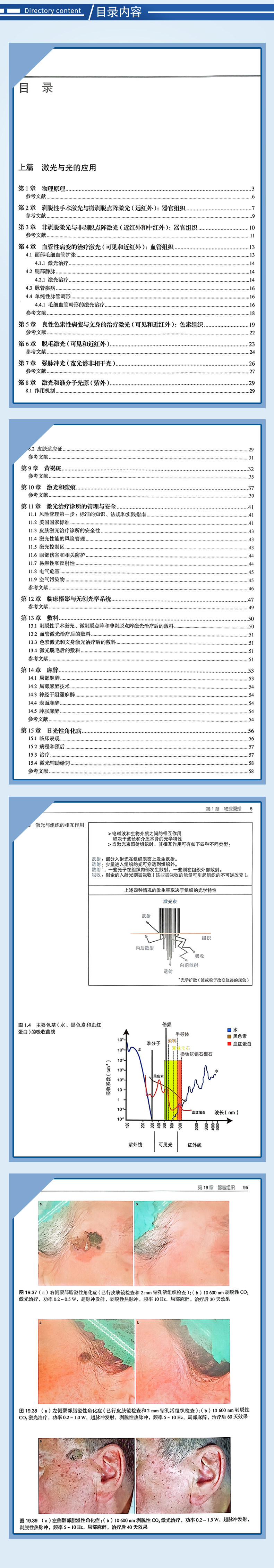 《激光与光皮肤病治疗实用图谱》中有大量光电在皮肤领域应用的基础知识,并就激光应用的相关原理、设备分类、治疗技术、生物效应特点等做了详尽、专业的描述。