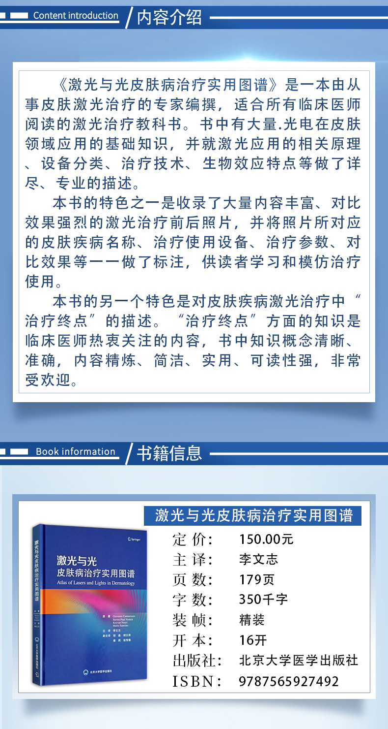 《激光与光皮肤病治疗实用图谱》是一本由从事皮肤激光治疗的专家编撰,适合所有临床医师阅读的激光治疗教科书。