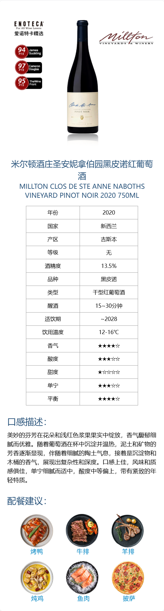 米尔顿酒庄圣安妮拿伯园黑皮诺红葡萄酒 2020 750ml
