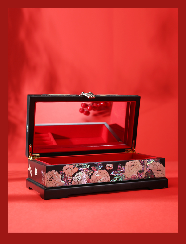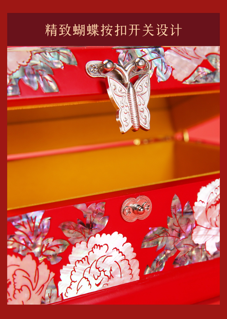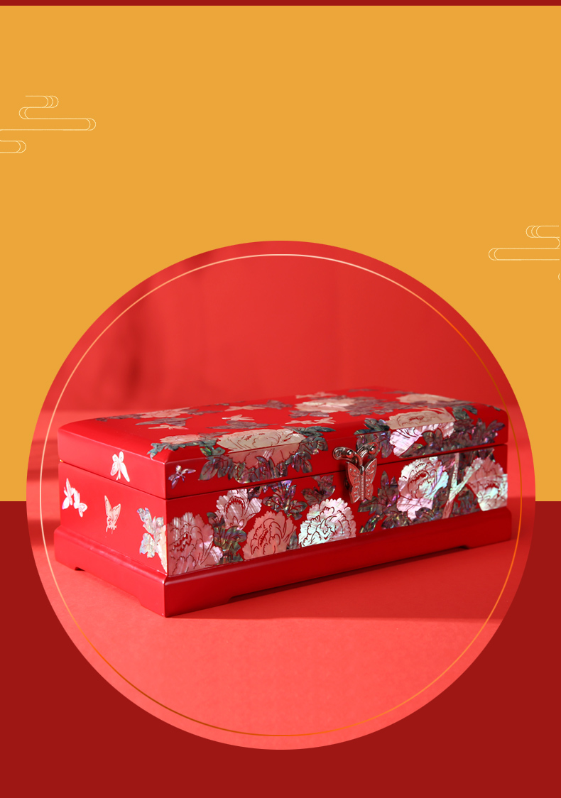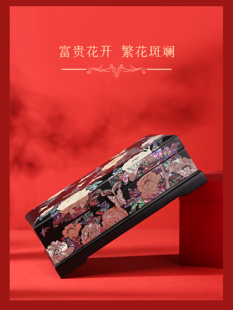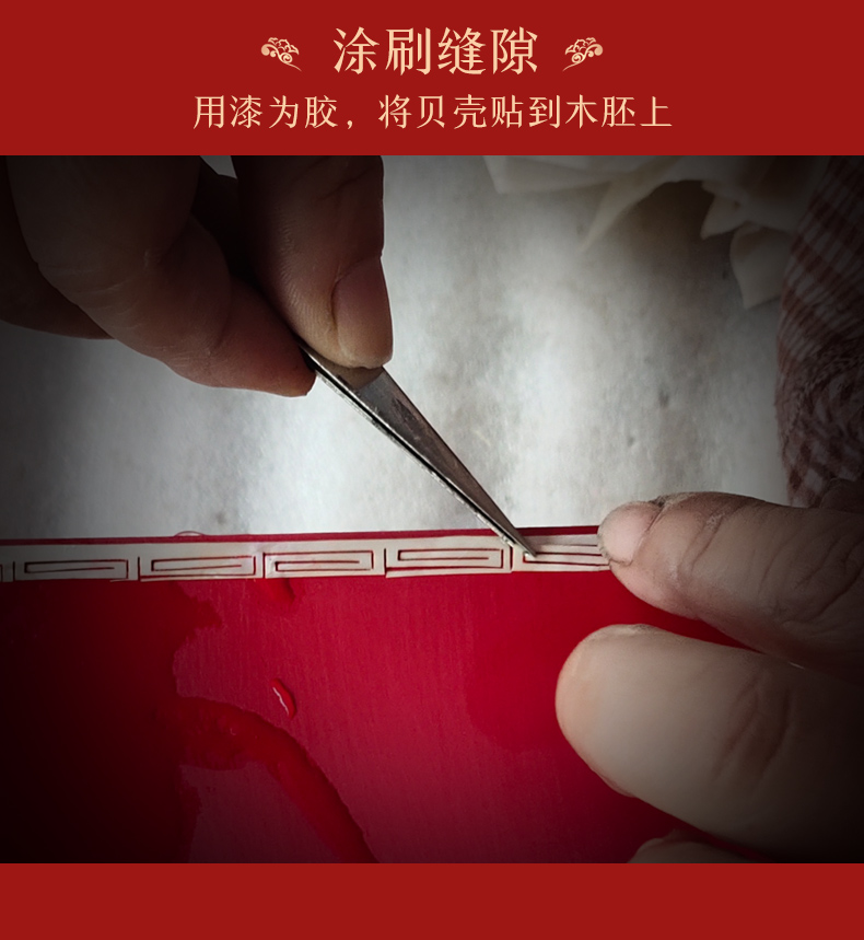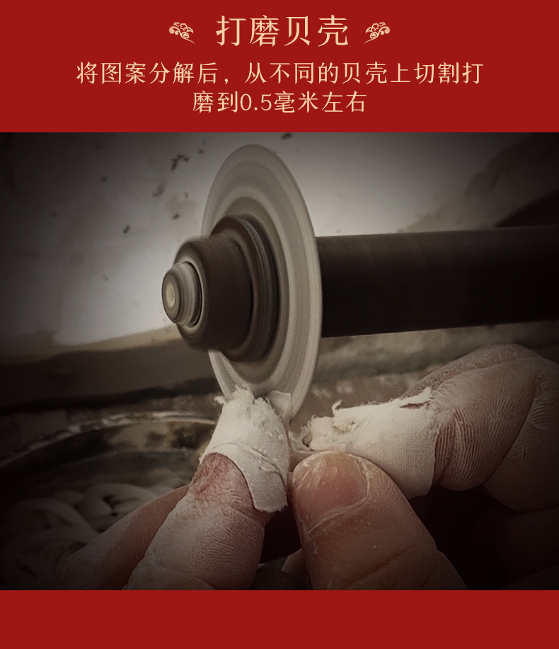 螺钿漆器的优点:1.表面所黏贴的贝壳都是纯天然的,大部分的色彩是贝壳天然的的色彩,可以保持千年不褪色。2.所有的螺钿漆器表面是有做过漆,特别是在江南的梅雨季节是不会发霉的。