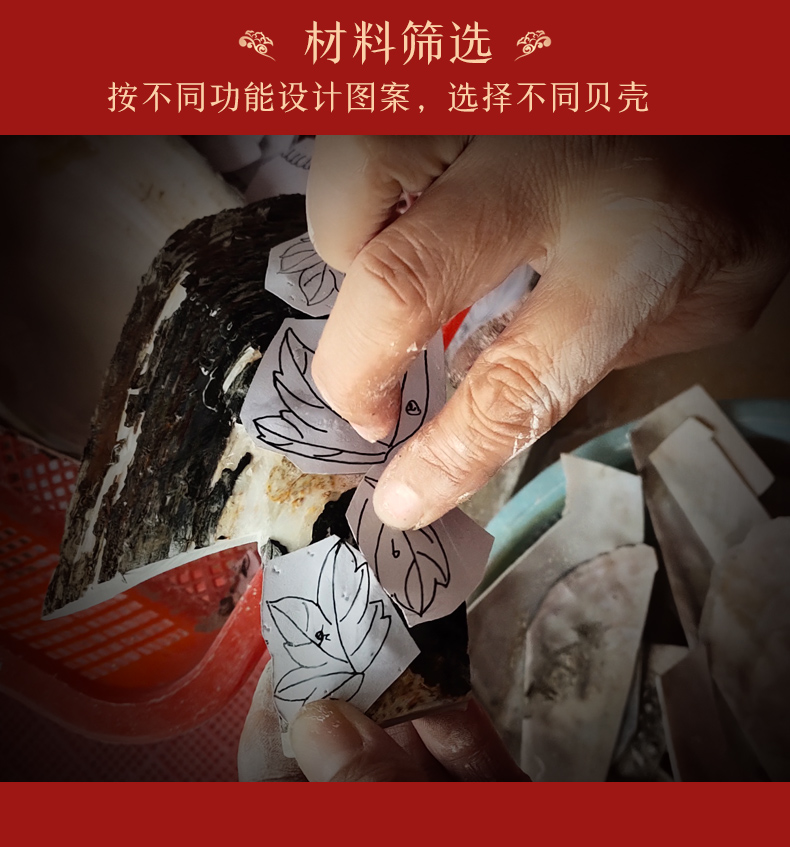 贝壳材料有:新西兰鲍鱼贝(号称珠宝级的贝壳)、渤海湾的鲍贝、珍珠蚌、像檀木梳上有描金彩绘工艺。