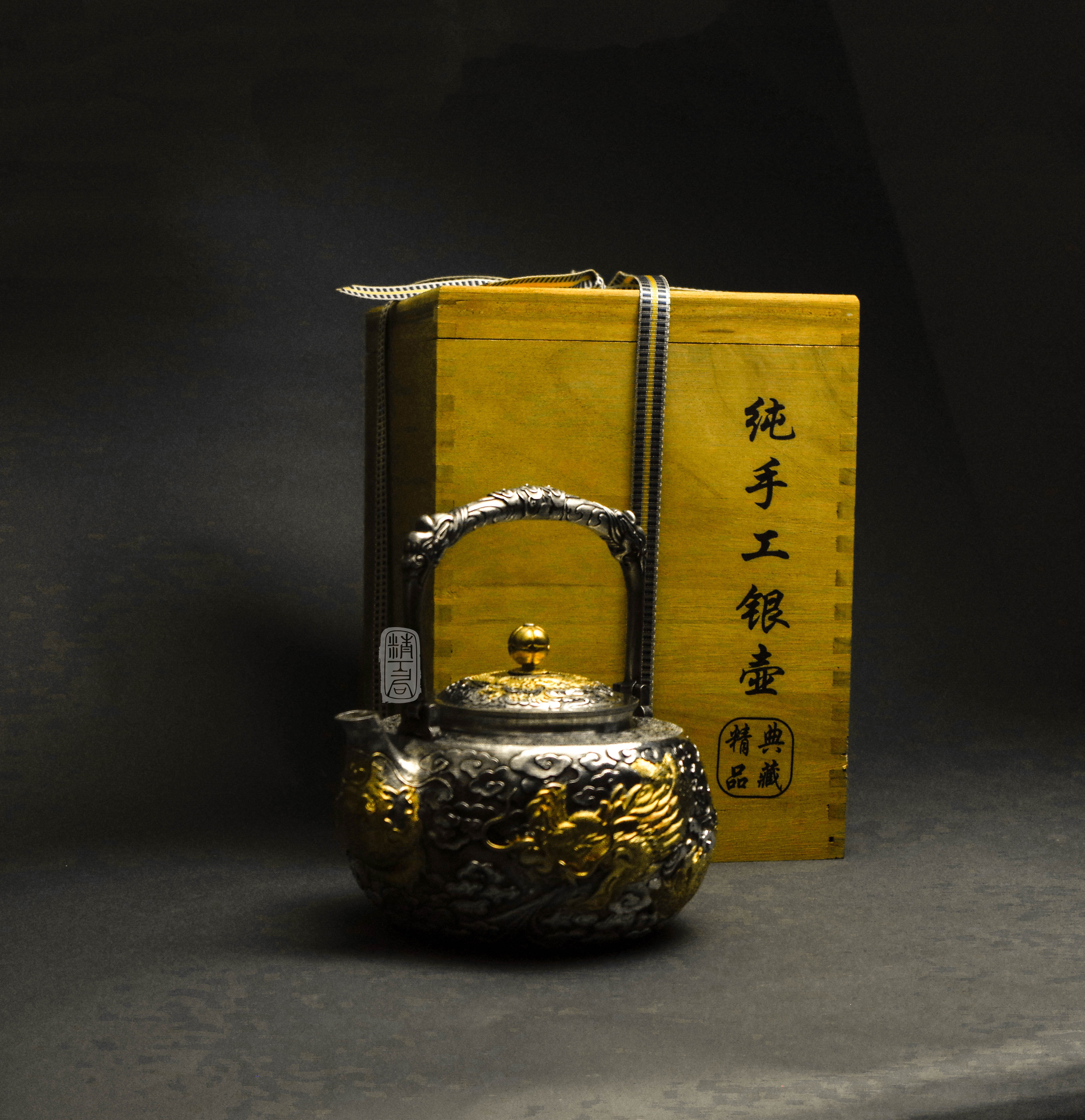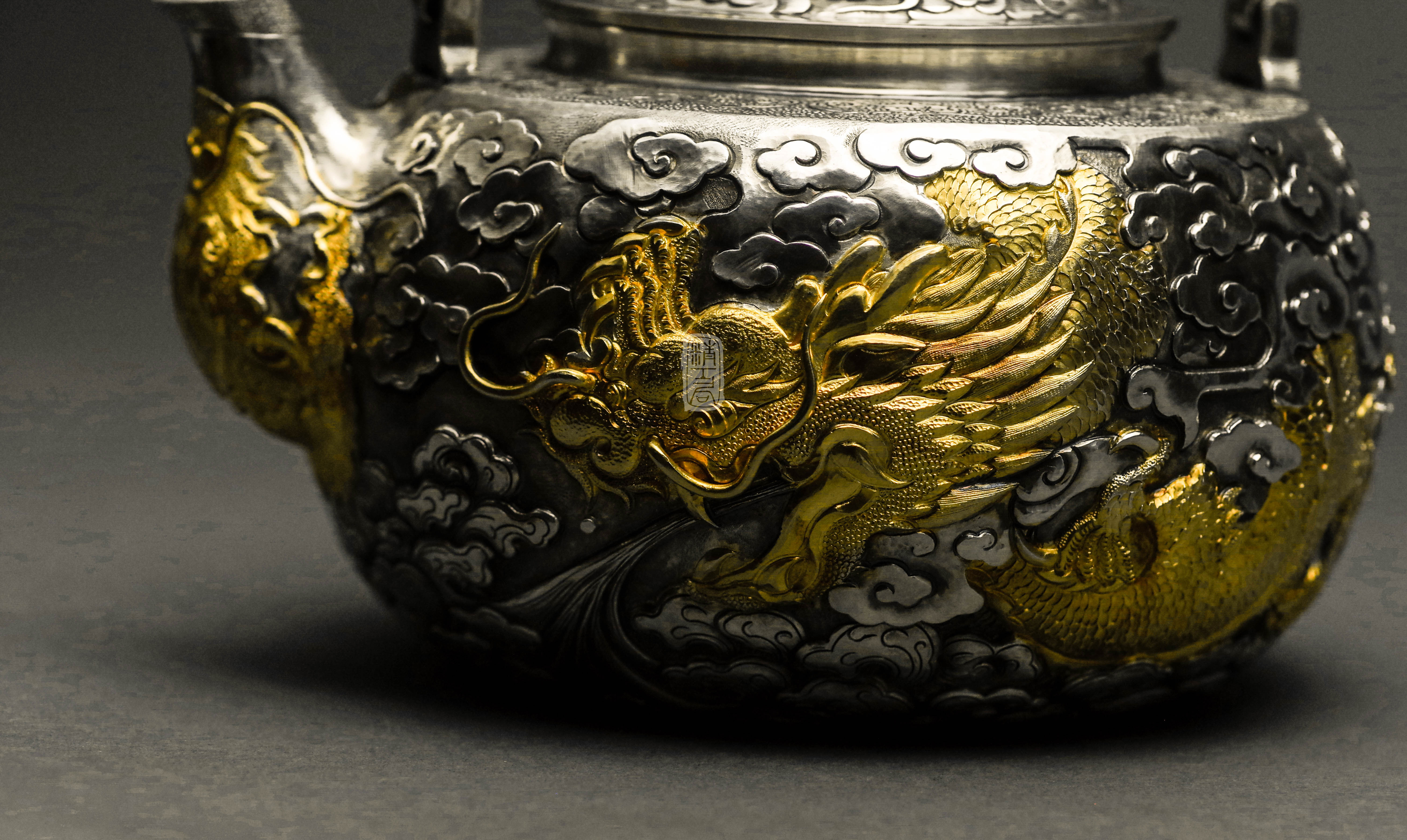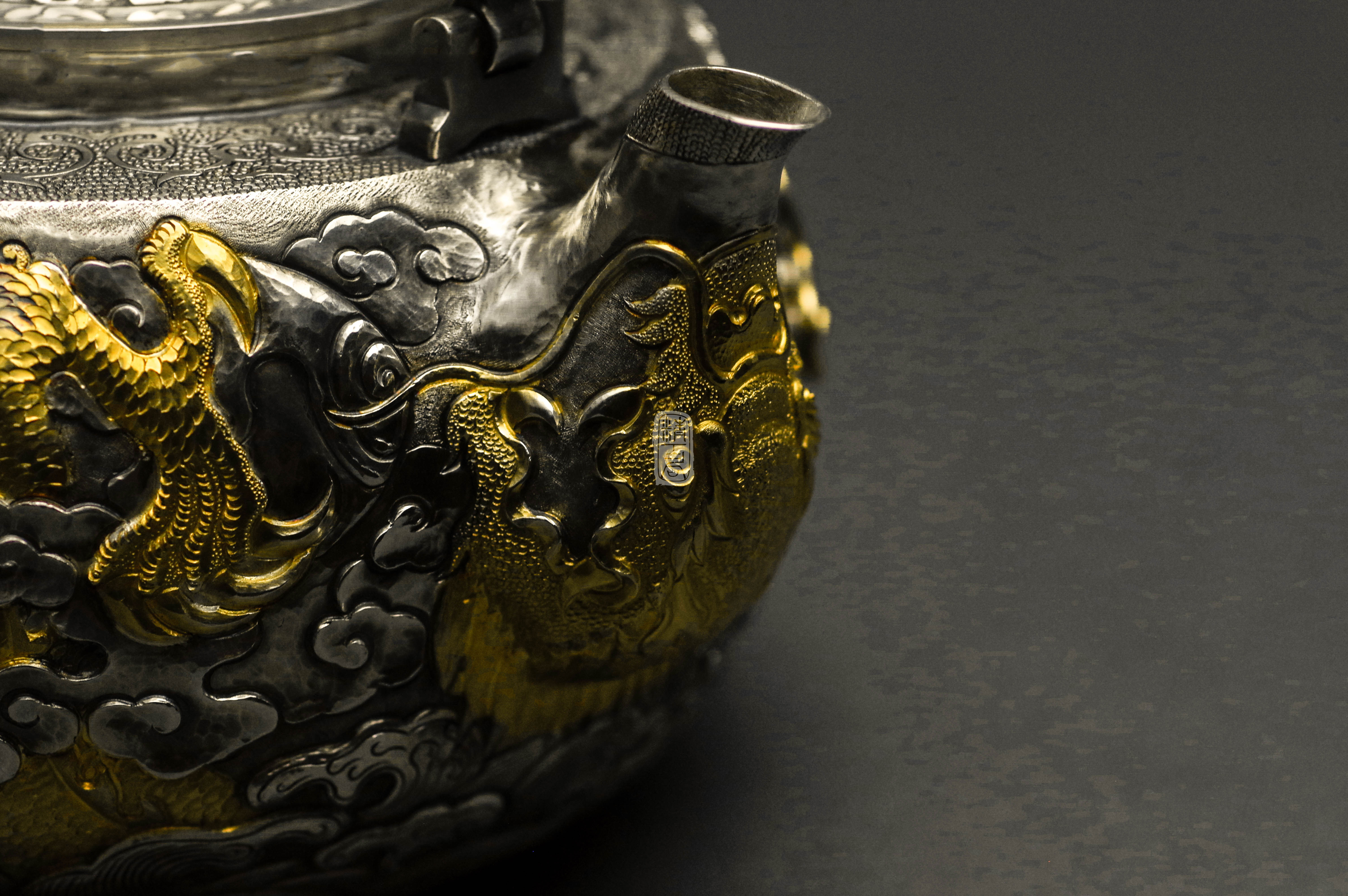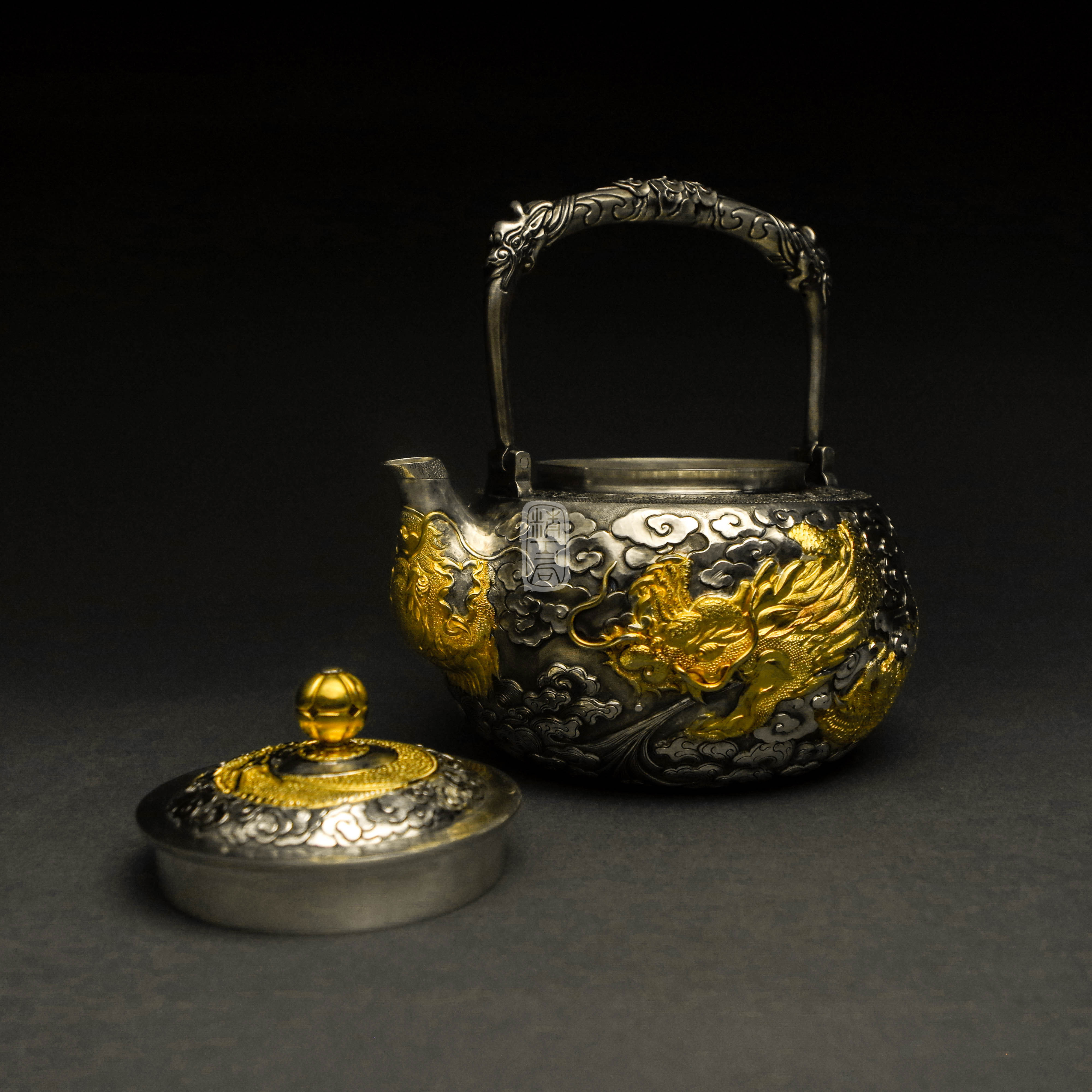 壶型饱满,鼓腹平肩,整个壶气息透着中庸中和之美。壶身、壶嘴、壶盖,提梁,都满工浮雕云龙,壶肩雕刻古典祥龙纹饰,壶身,壶盖,壶嘴上金龙全部鎏金。