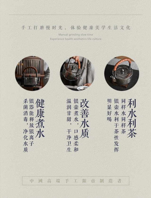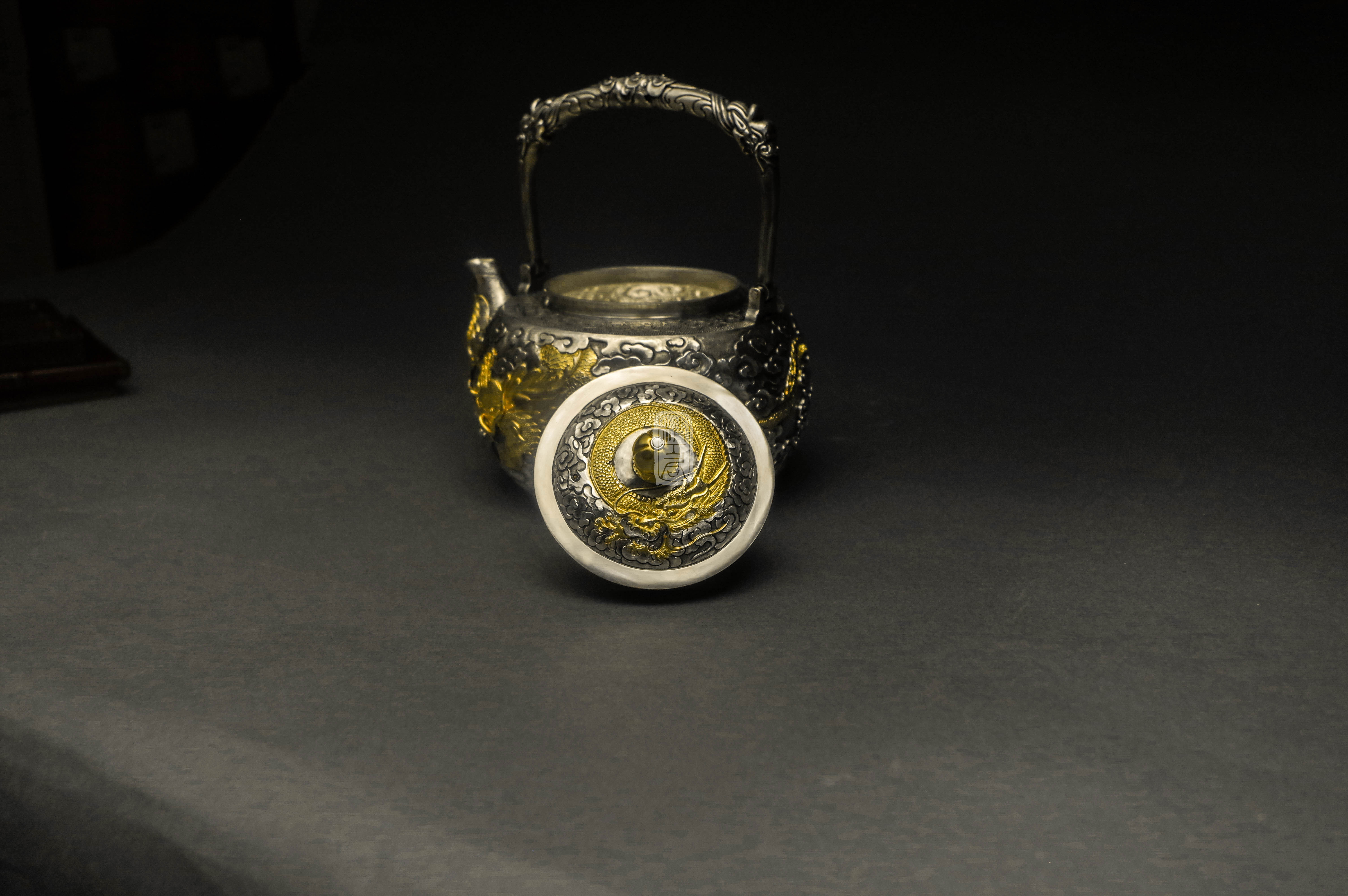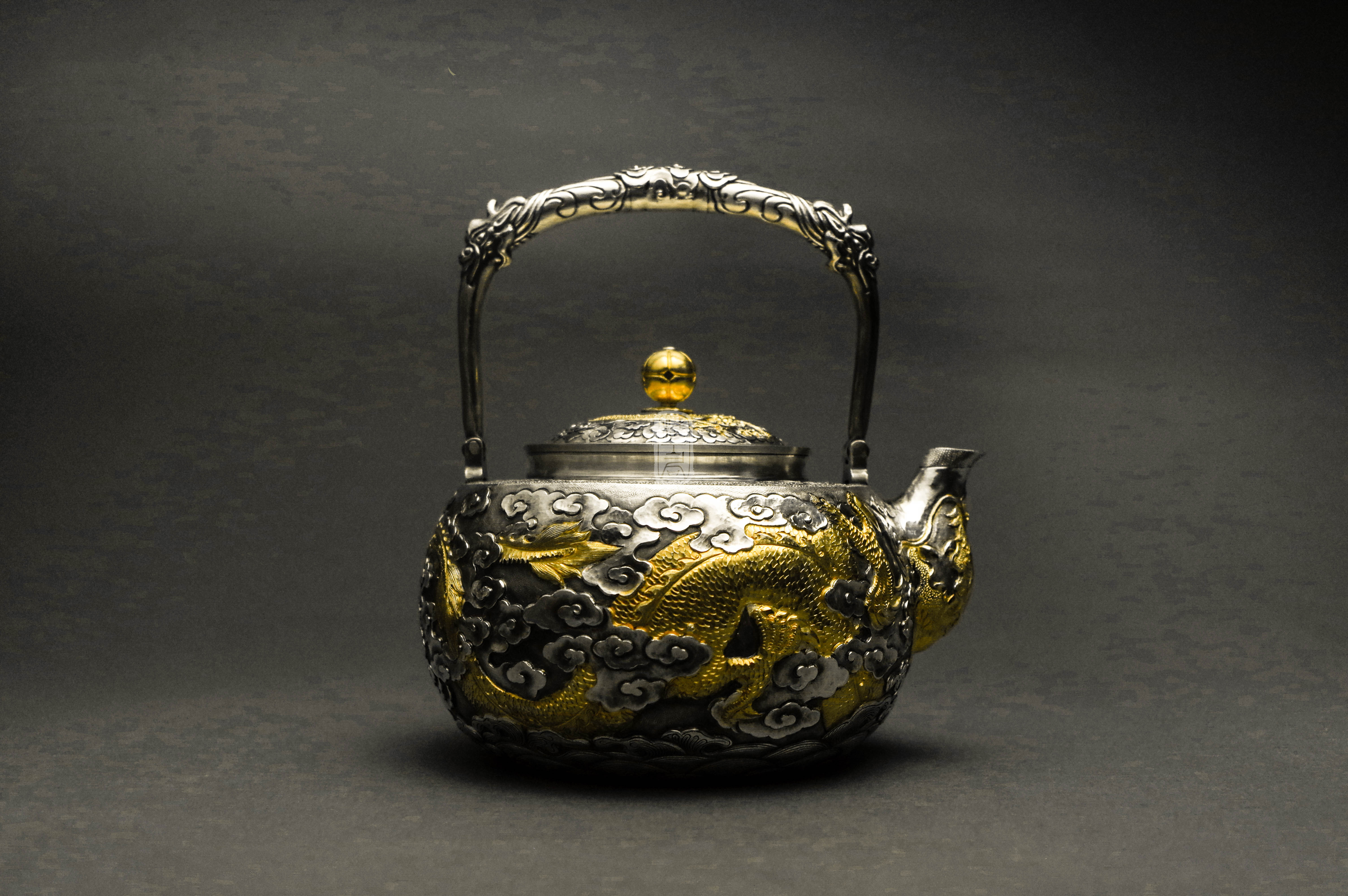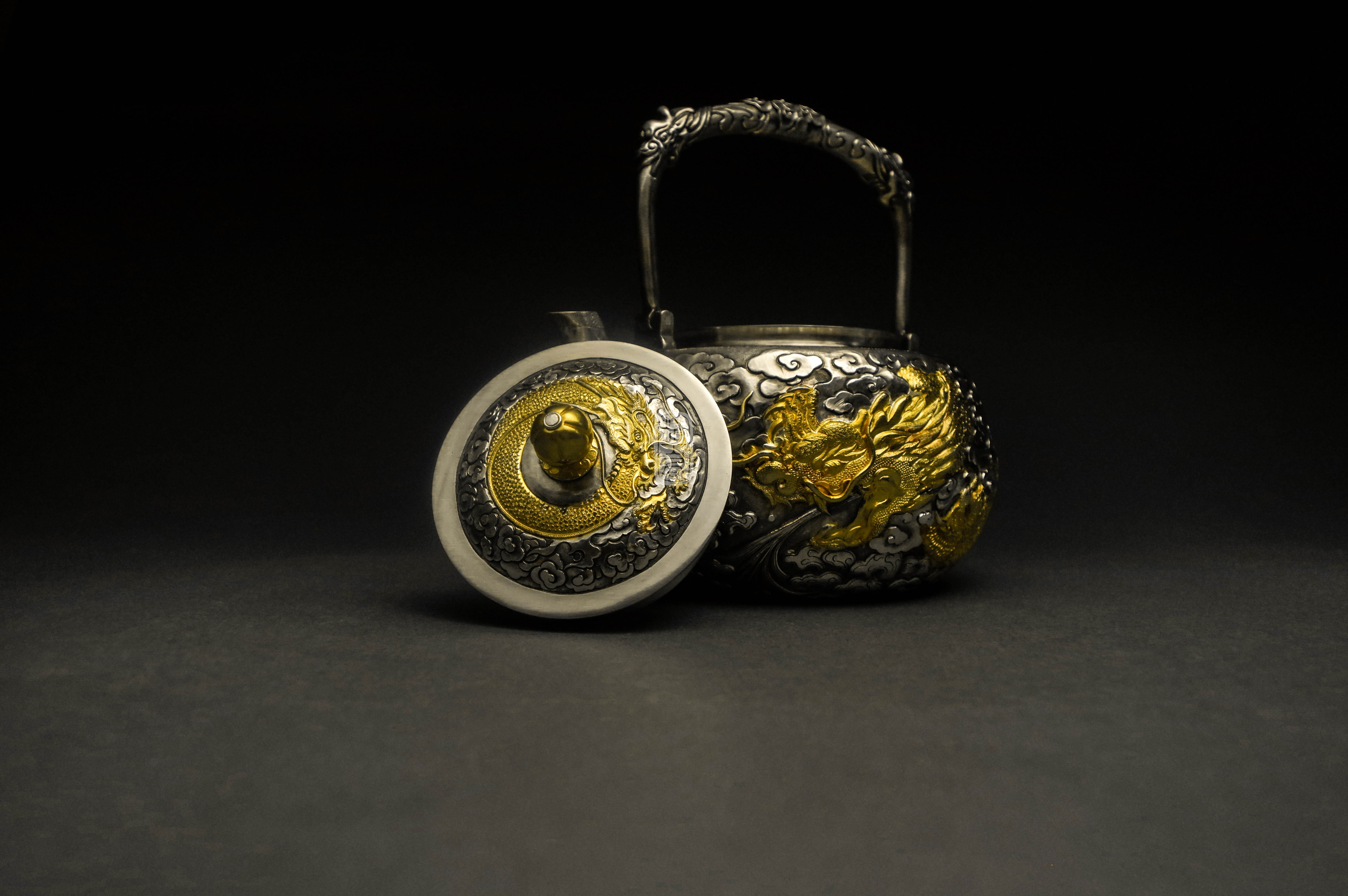 壶型饱满,鼓腹平肩,整个壶气息透着中庸中和之美。壶身、壶嘴、壶盖,提梁,都满工浮雕云龙,壶肩雕刻古典祥龙纹饰,壶身,壶盖,壶嘴上金龙全部鎏金。