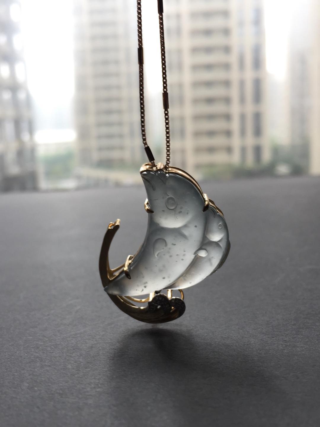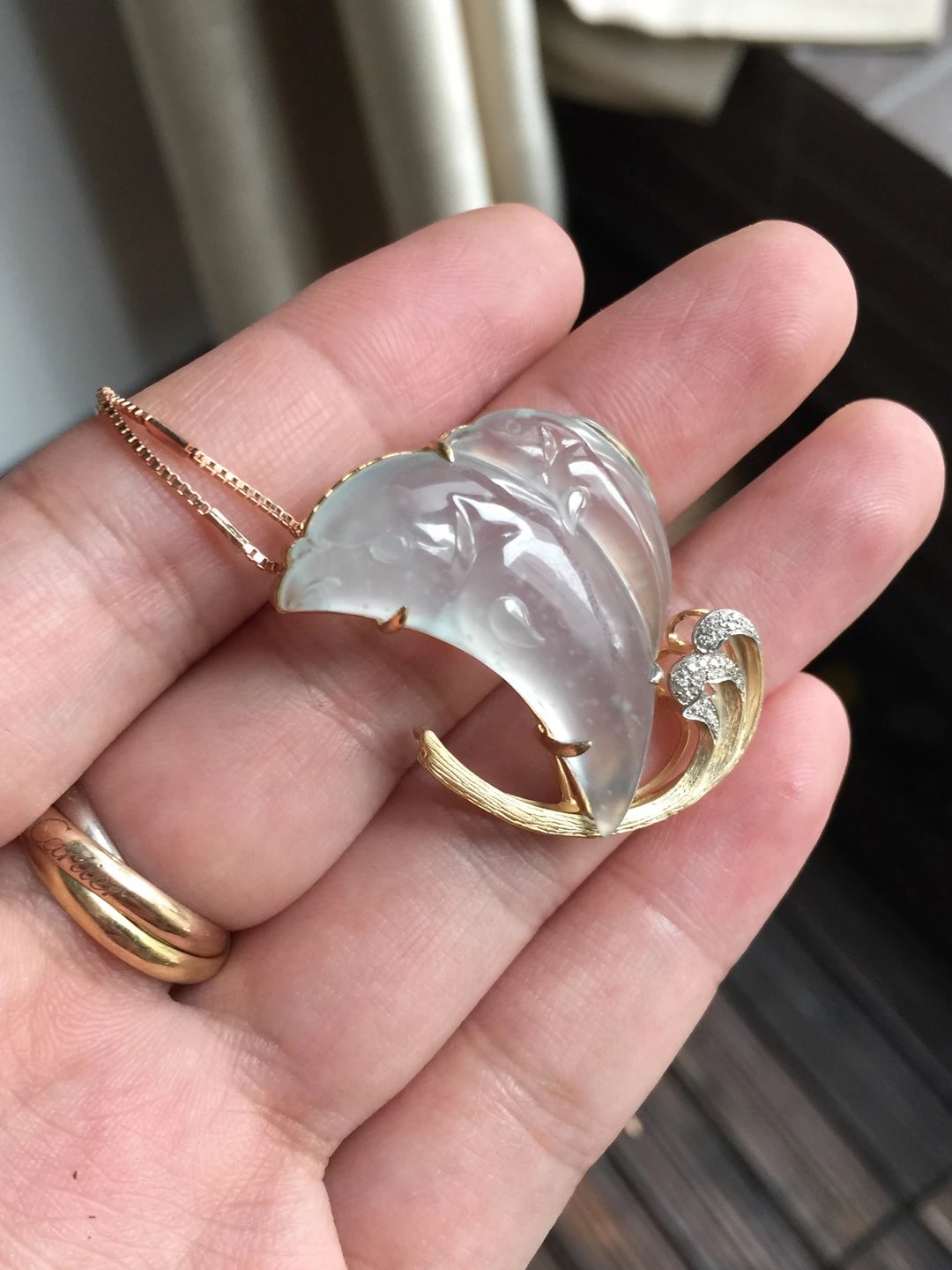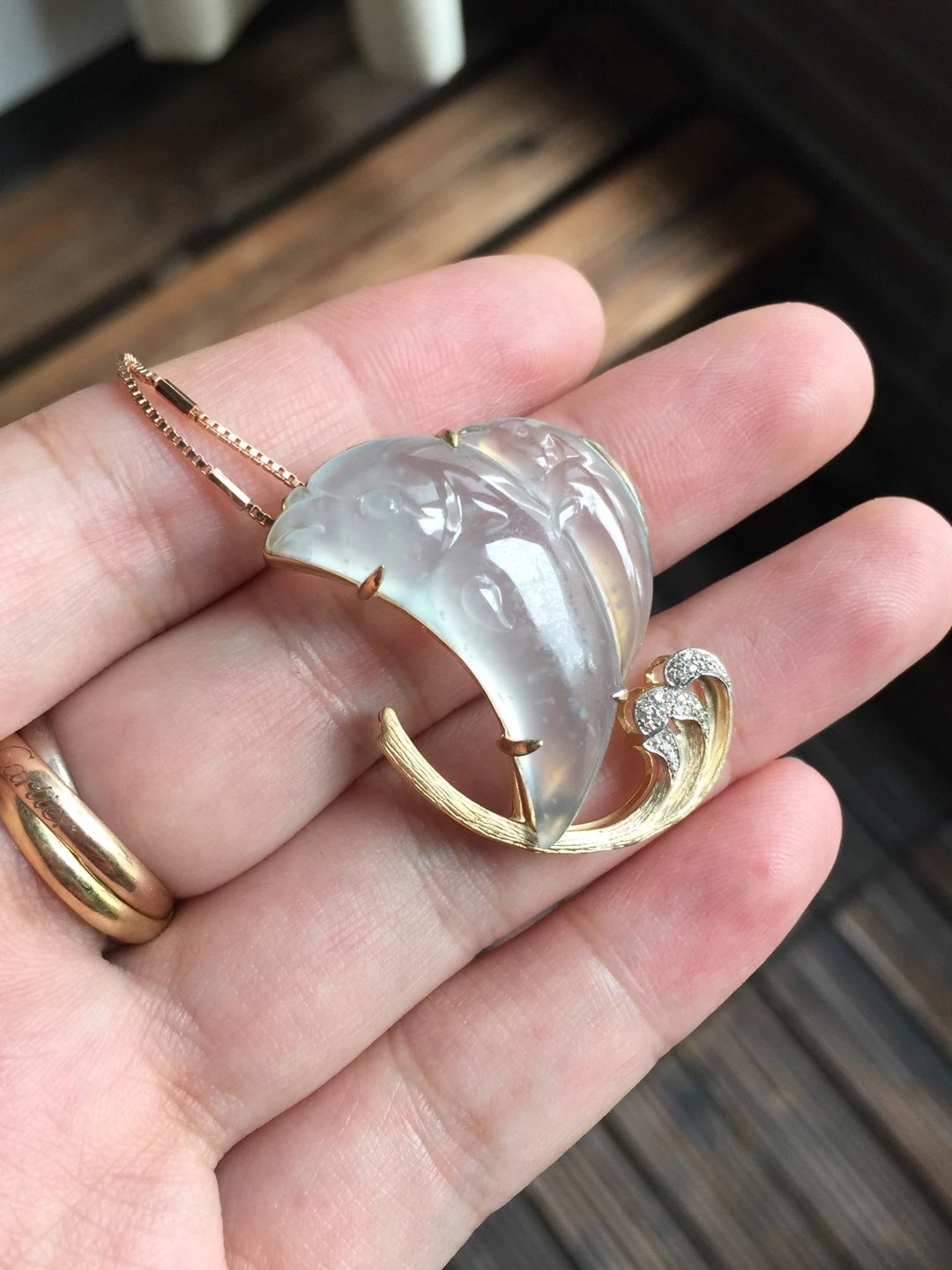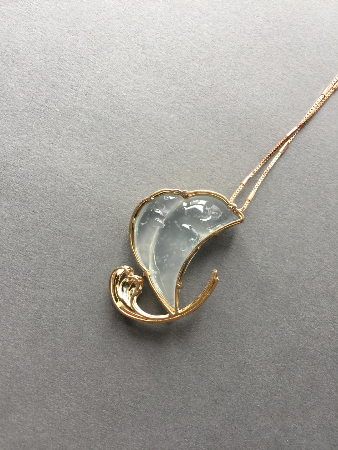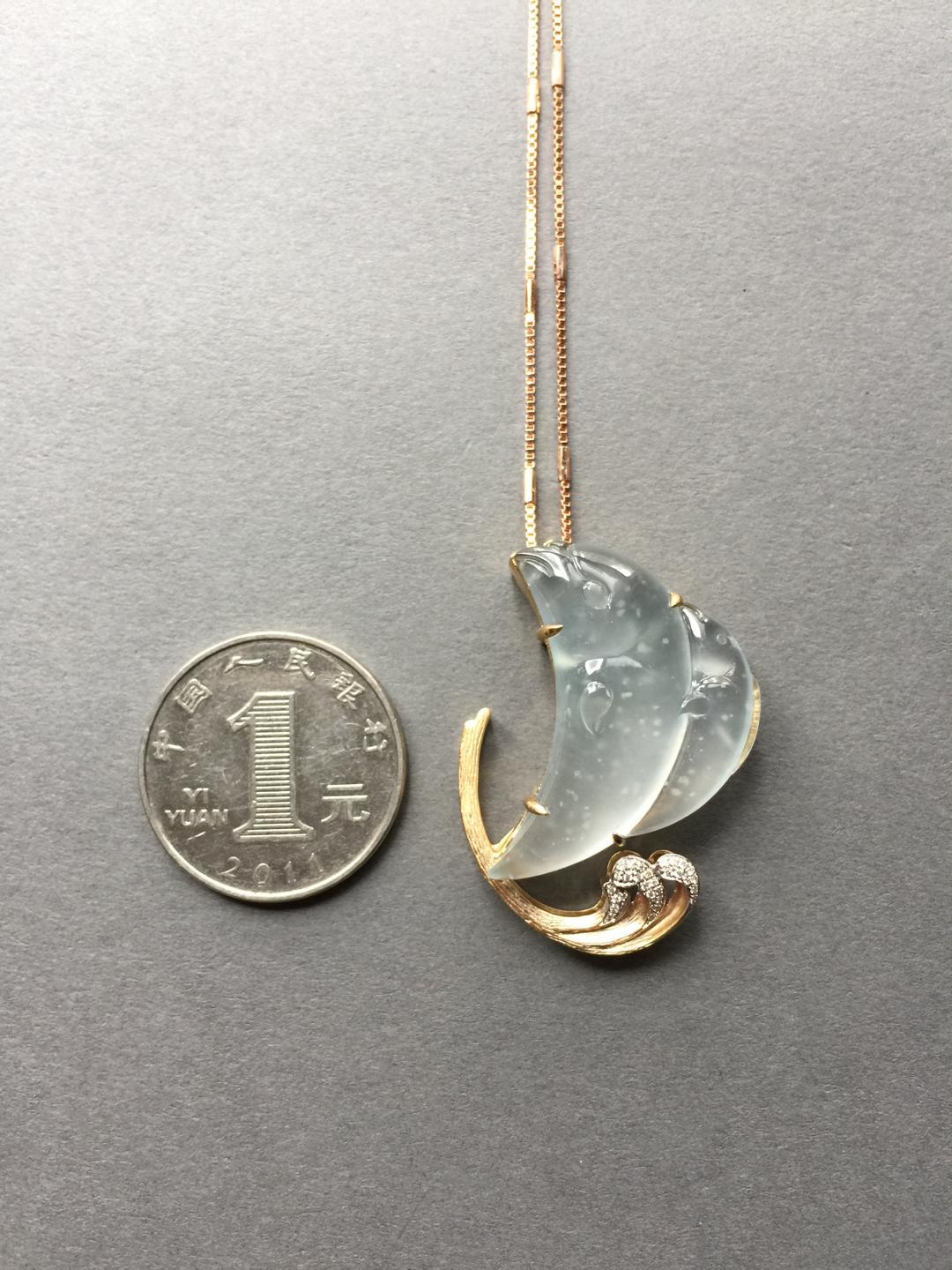 浪漫海洋主题,翡翠高冰种雪花棉母子豚,30.5*18.2*5.7mm,镶嵌后37.1*28.4*10.7mm。近玻璃种的种水。荧光四射,丝绸般爽滑的质感,雪花棉浪漫氛围感,母子豚是母爱主题,海豚妈妈背着孩子乘风破浪,寓意母子平安,步步高升,18k黄金钻石镶嵌,工艺精致到每一朵浪花。按照现在的行情,这样的雪花棉厚装翡翠裸石都在两万以上了,更别说还有两千多的镶嵌。我们的价格简直了,性价比推荐