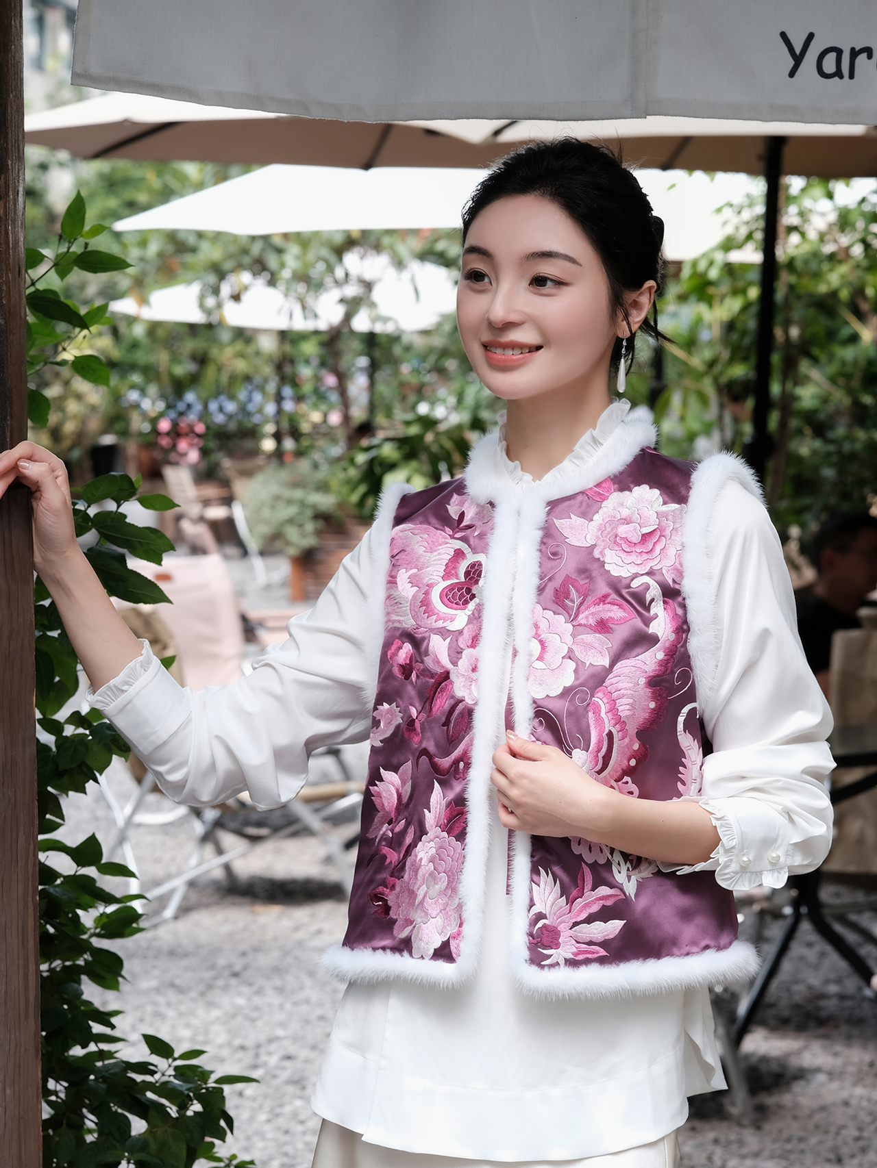 盛唐牡丹盛奢系列 | 蝶戏牡丹手绣真丝水貂棉马甲