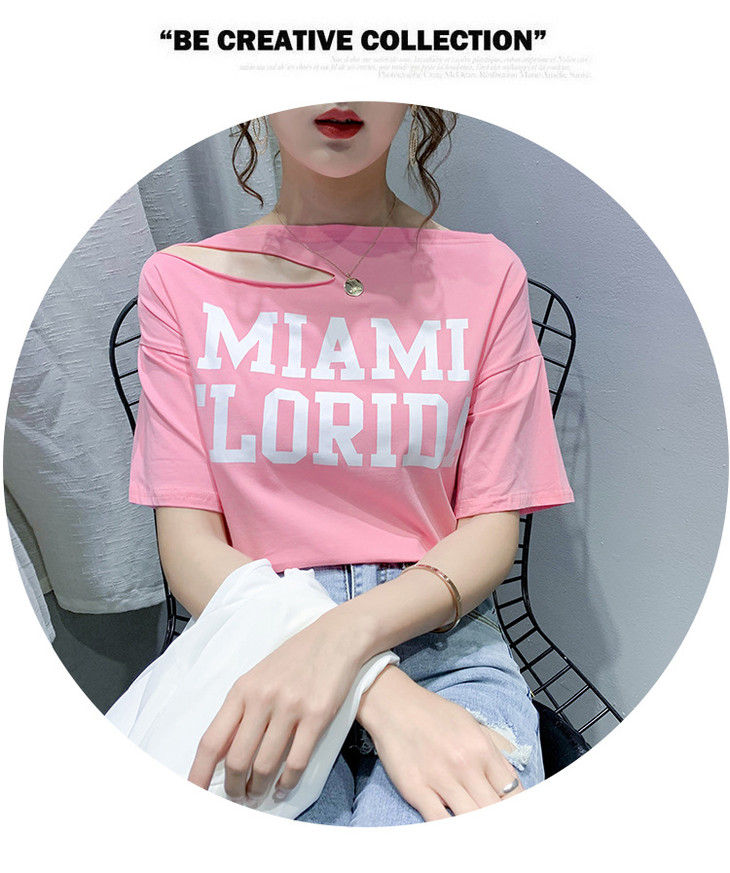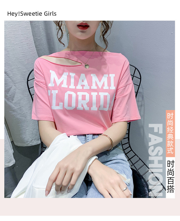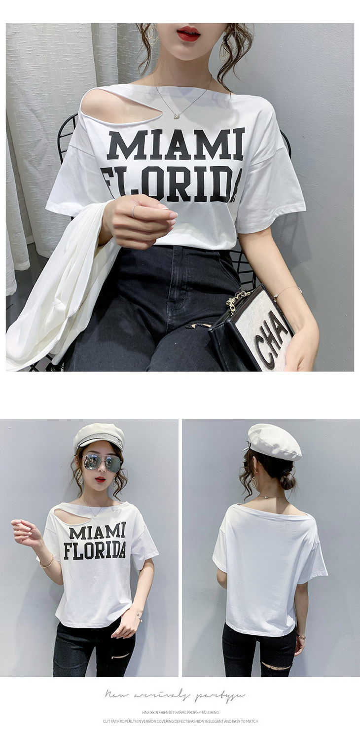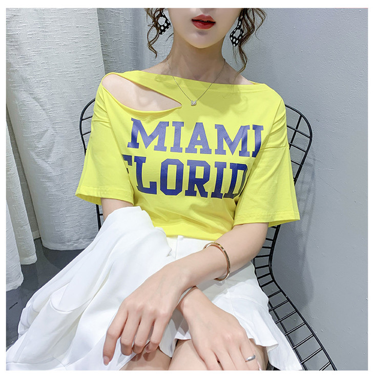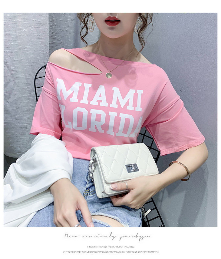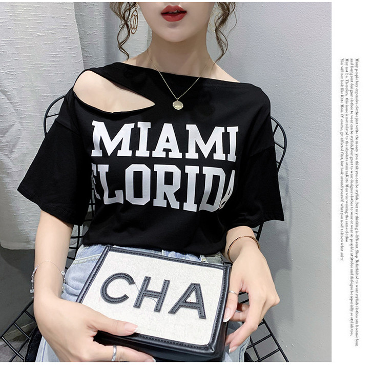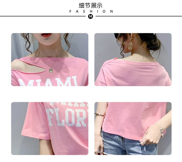 【女装】-露肩锁骨一字领宽松半袖上衣设计感小众短袖t恤女潮