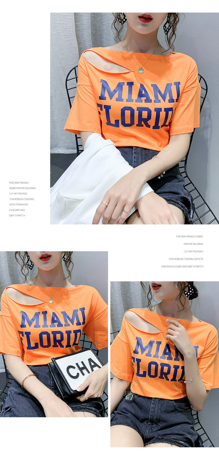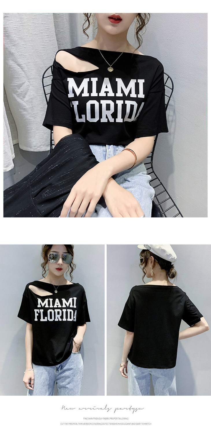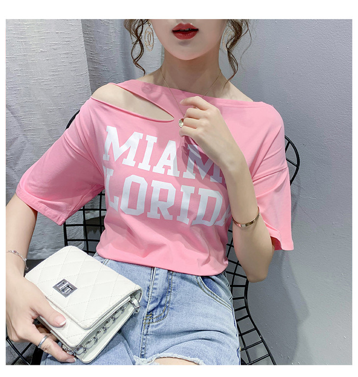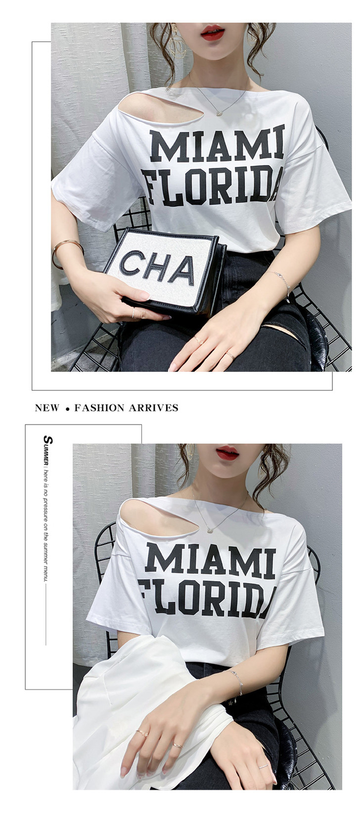 【女装】-露肩锁骨一字领宽松半袖上衣设计感小众短袖t恤女潮