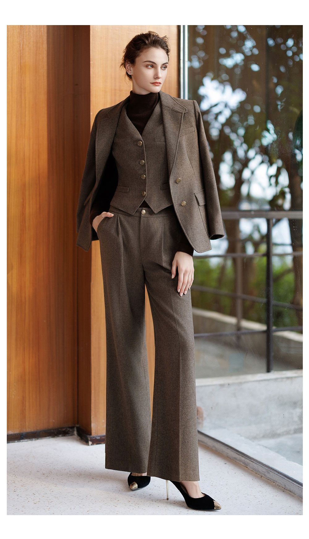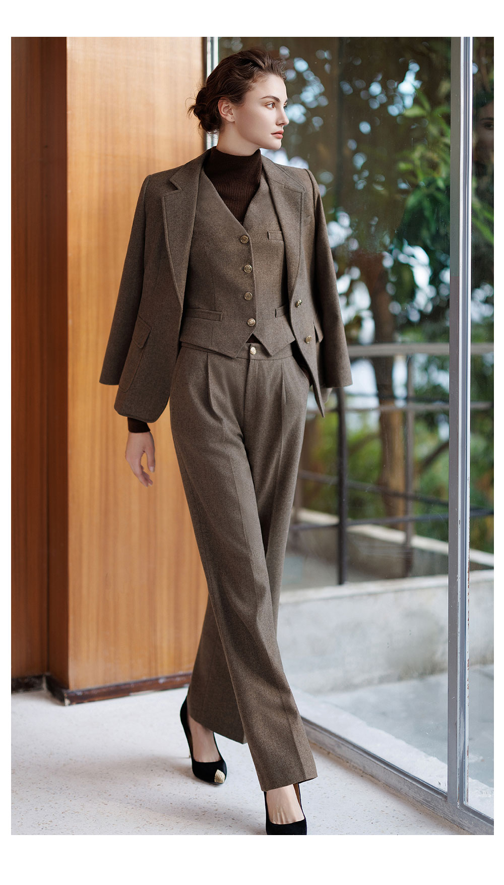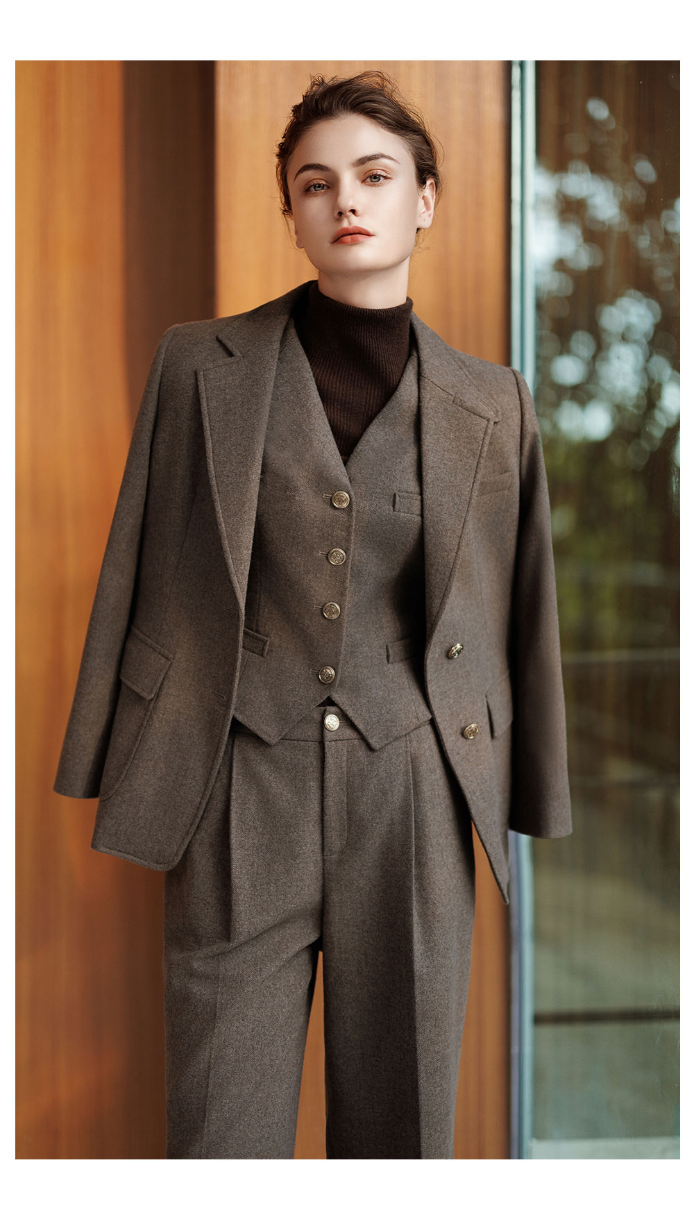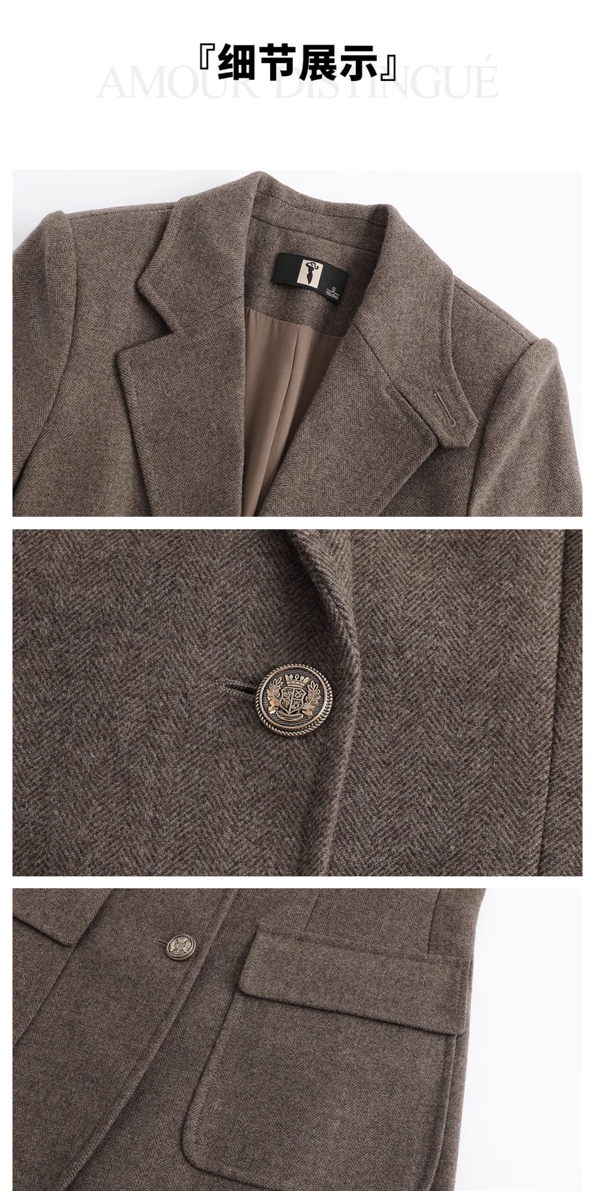 AD秋冬棕色羊毛西装套装女2025新款高级感毛呢外套时尚马甲三件套