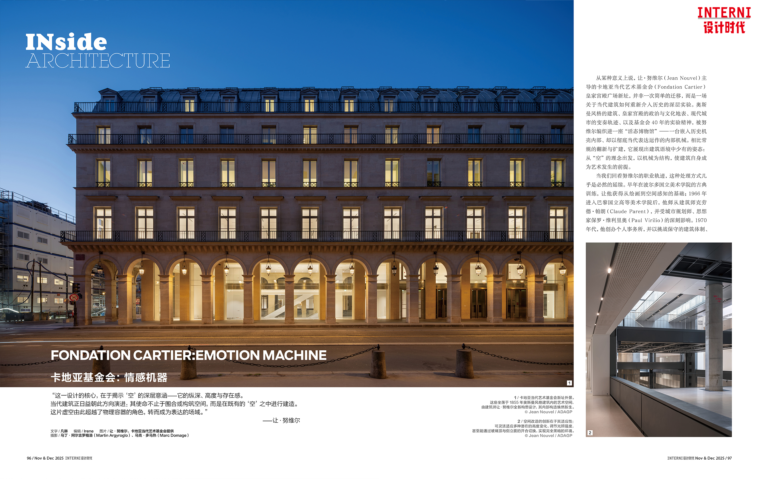 “这一设计的核心,在于揭示‘空’的深层意涵——它的纵深、高度与存在感。当代建筑正日益朝此方向演进:其使命不止于围合或构筑空间,而是在既有的‘空’之中进行建造。这片虚空由此超越了物理容器的角色,转而成为表达的场域。”——让·努维尔