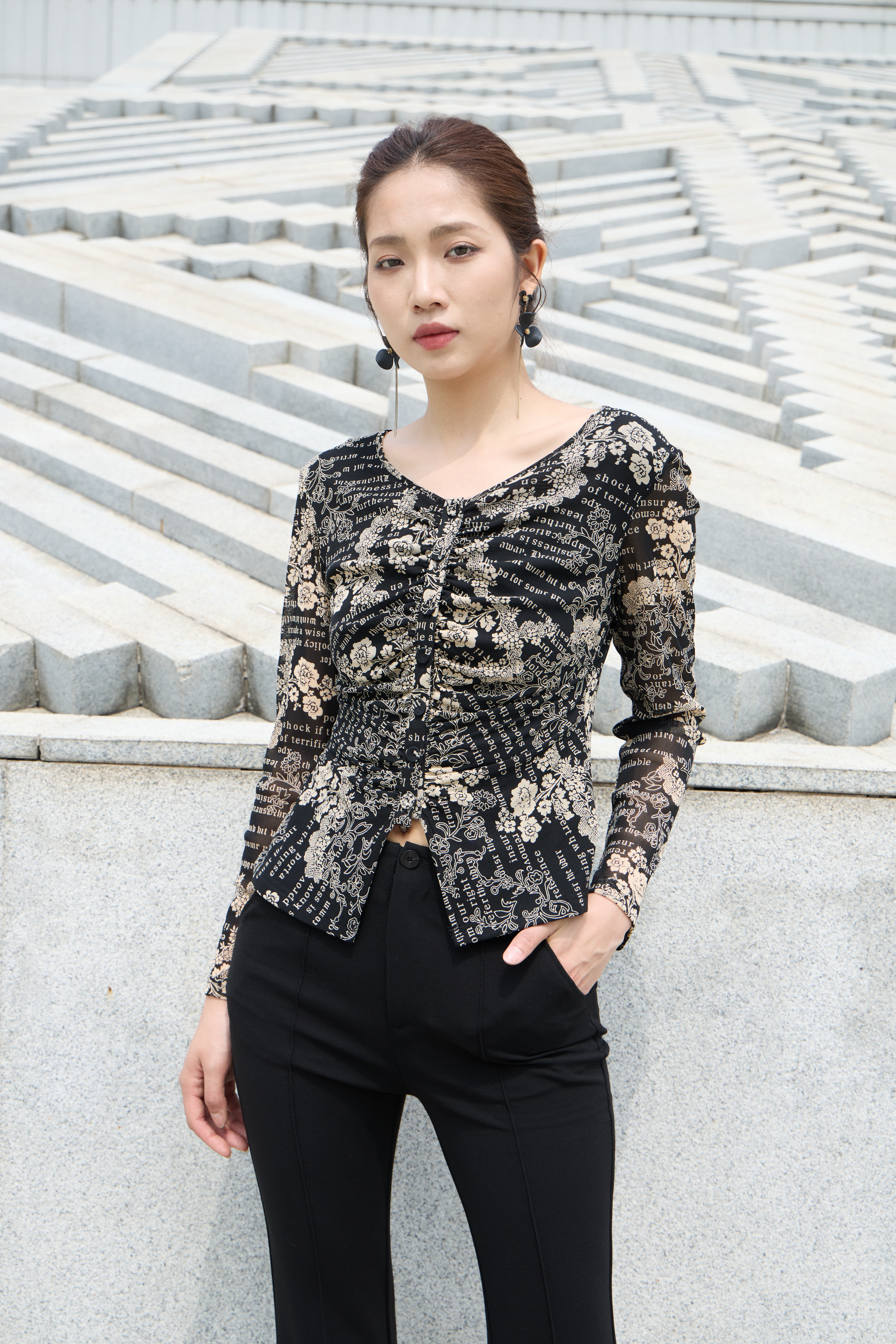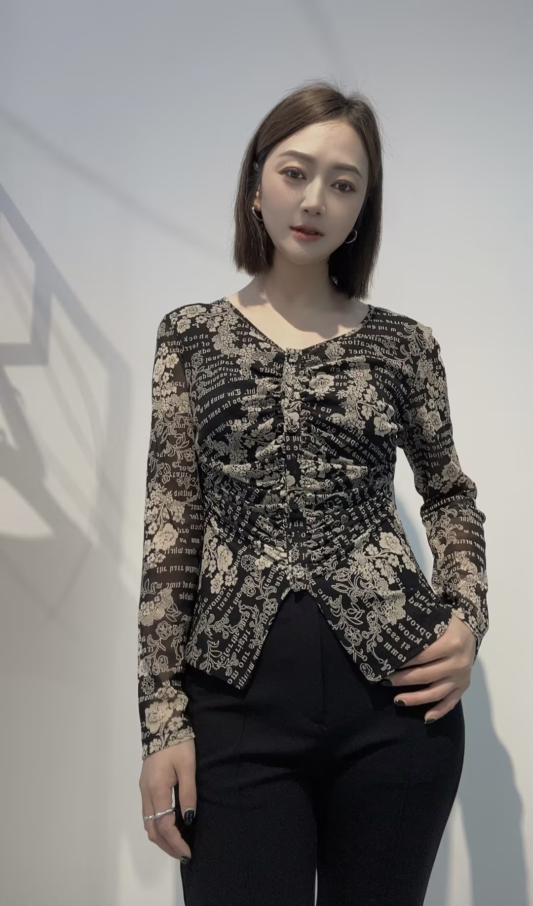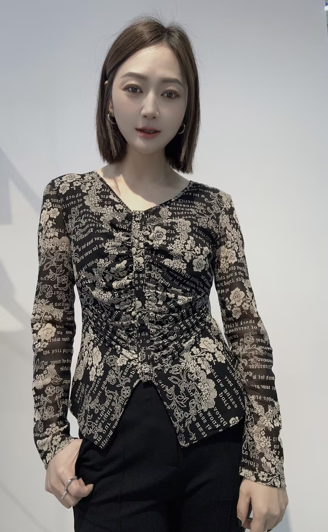 SZ1T51_漆黑色_T恤_春夏_长袖V领抽褶修身显瘦气质通勤_高级女装_BERNIEELEN 伯妮斯茵