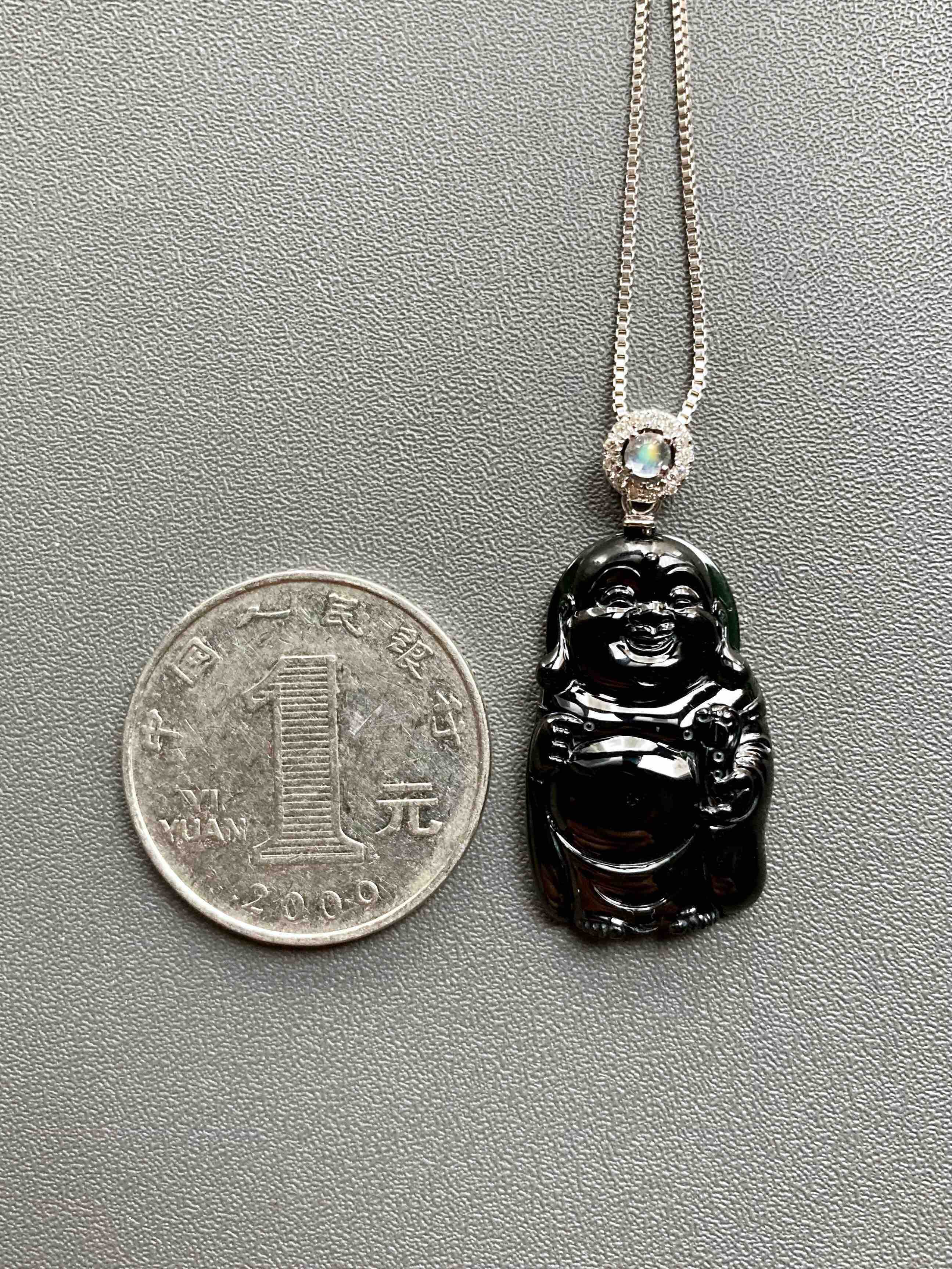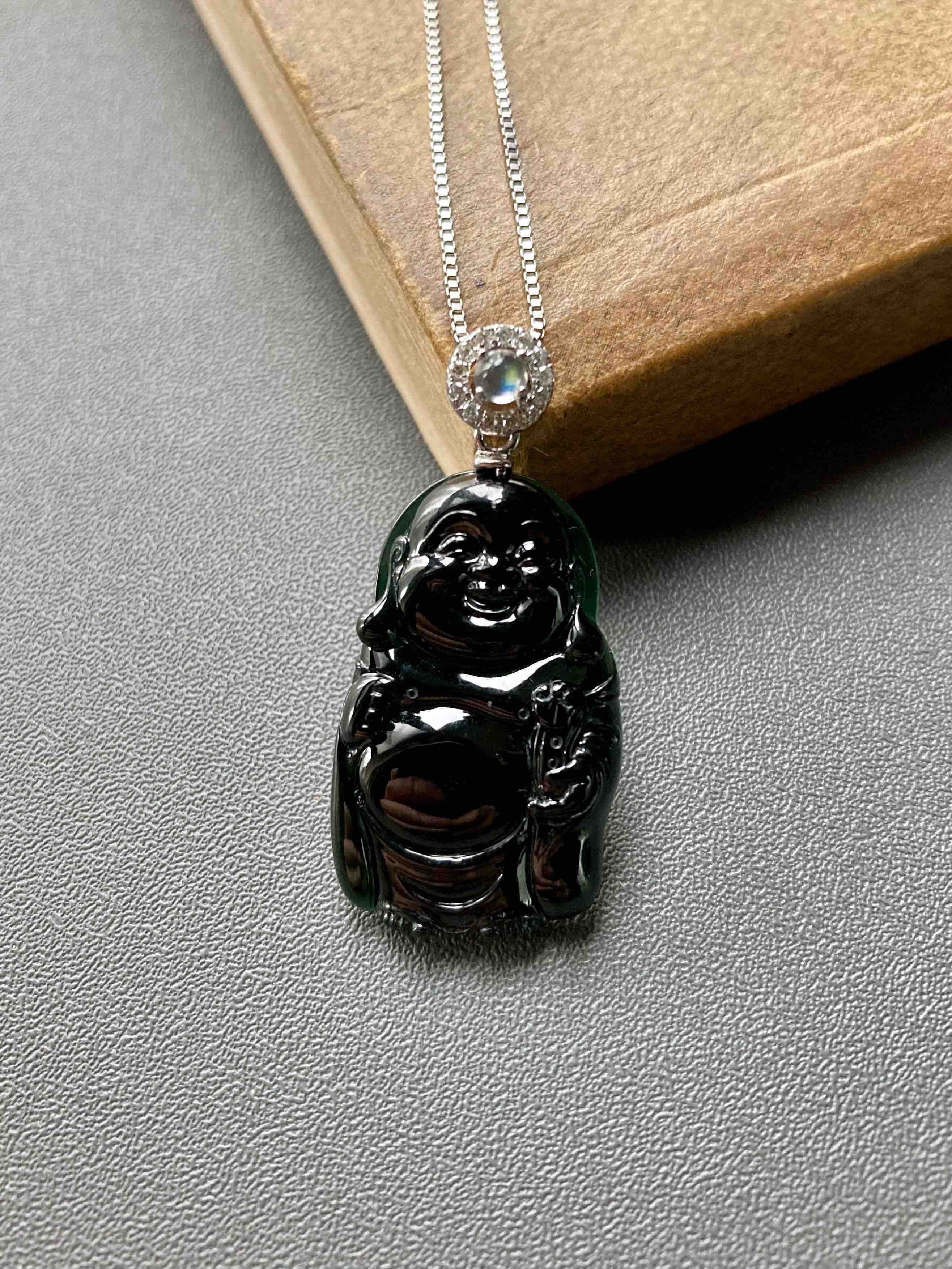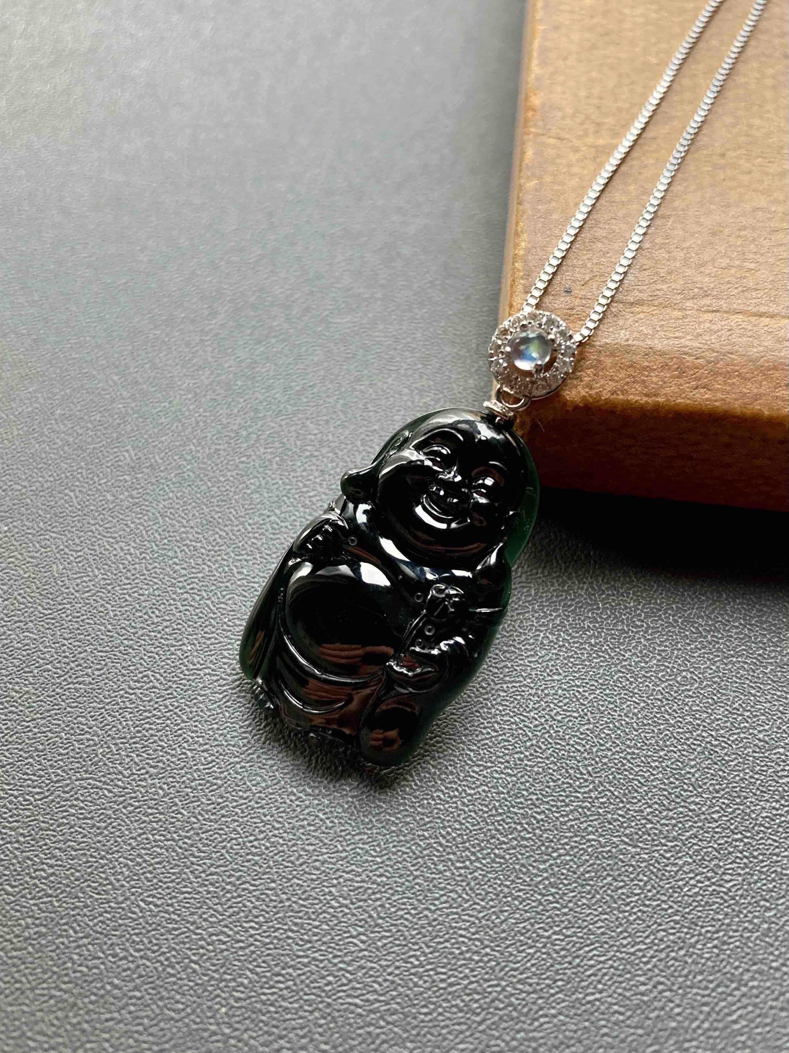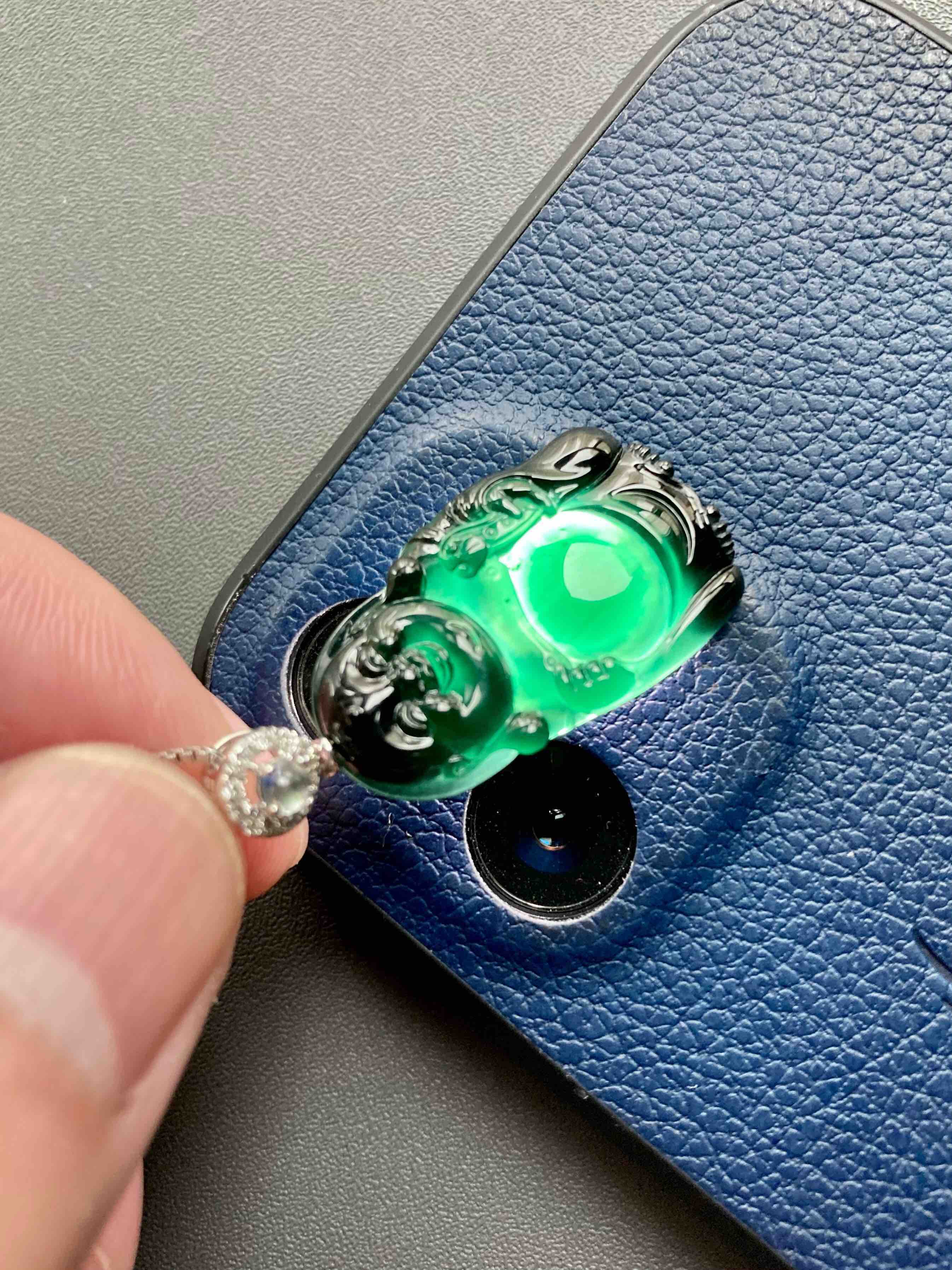 高冰种墨翠弥勒佛逍遥佛,26.5×16.4×4mm,镶嵌后34.1×16.4×.4mm,标本级的硬货,玩墨翠的必须收一个这样的,高冰种翡翠弥勒佛,从种水到雕刻,纯粹的美感,打灯全绿,通透无比,这品质的东西不容易,高性价比,18k白金钻石镶嵌变彩月光石扣头,两个字——精品