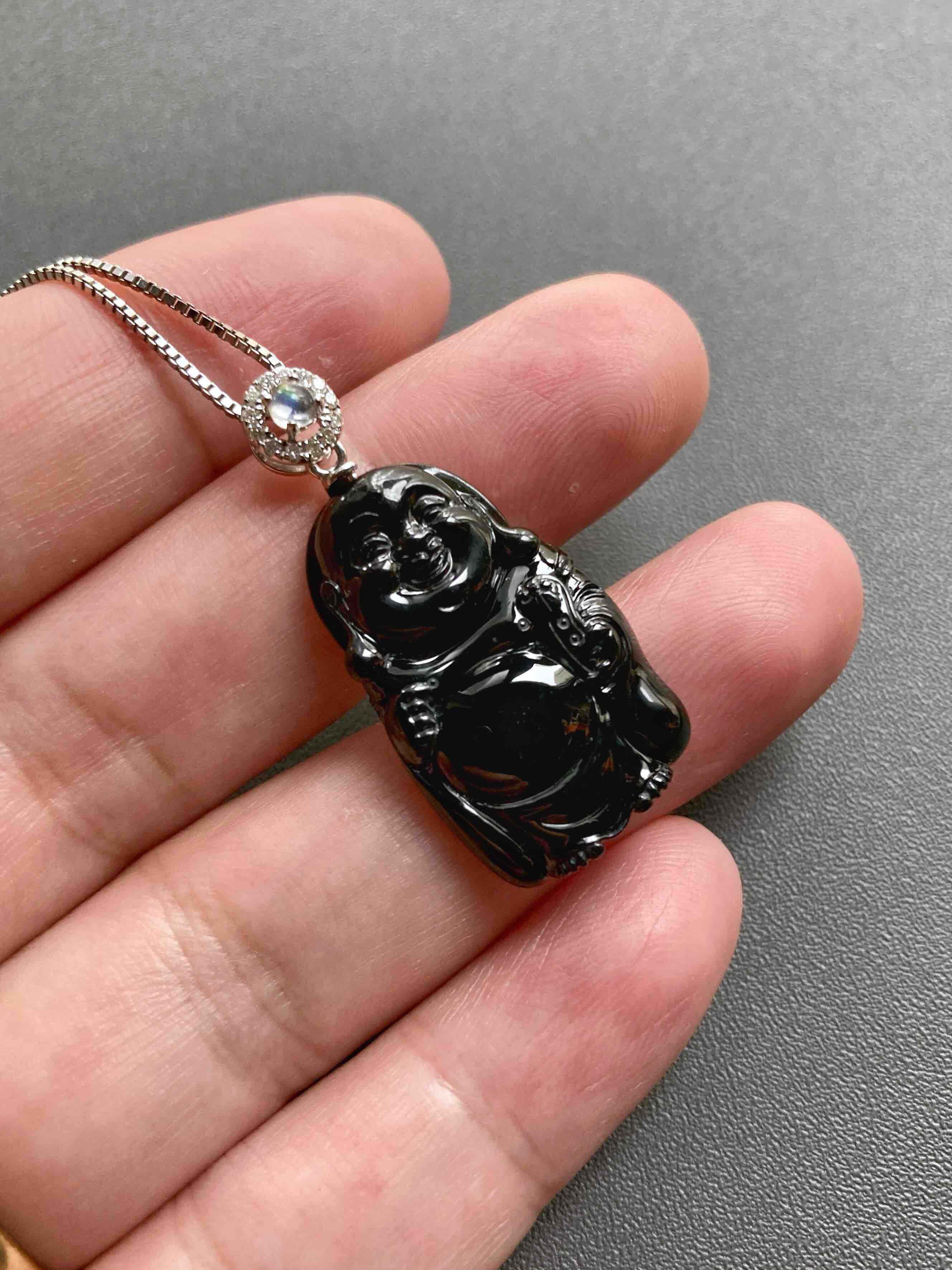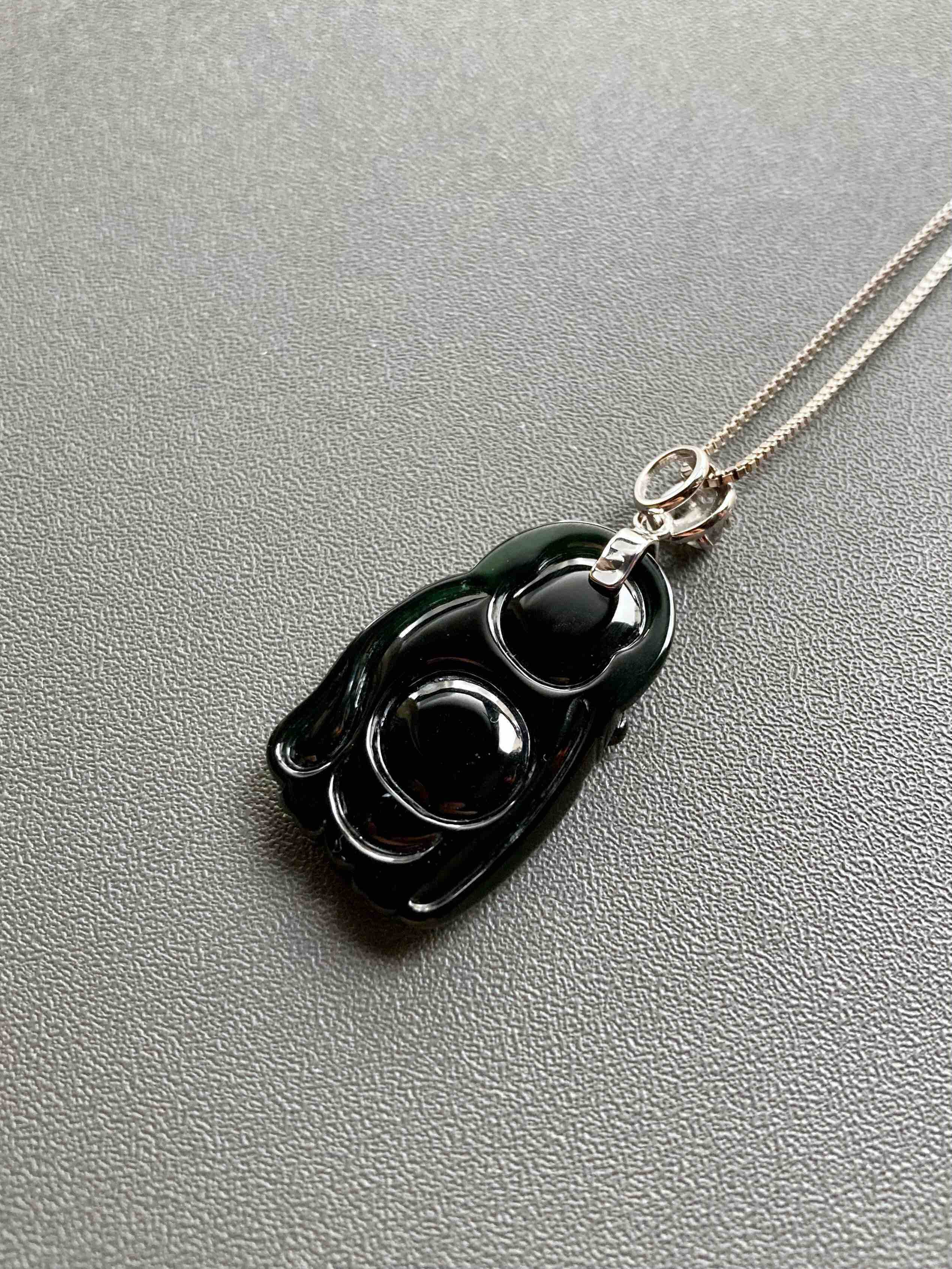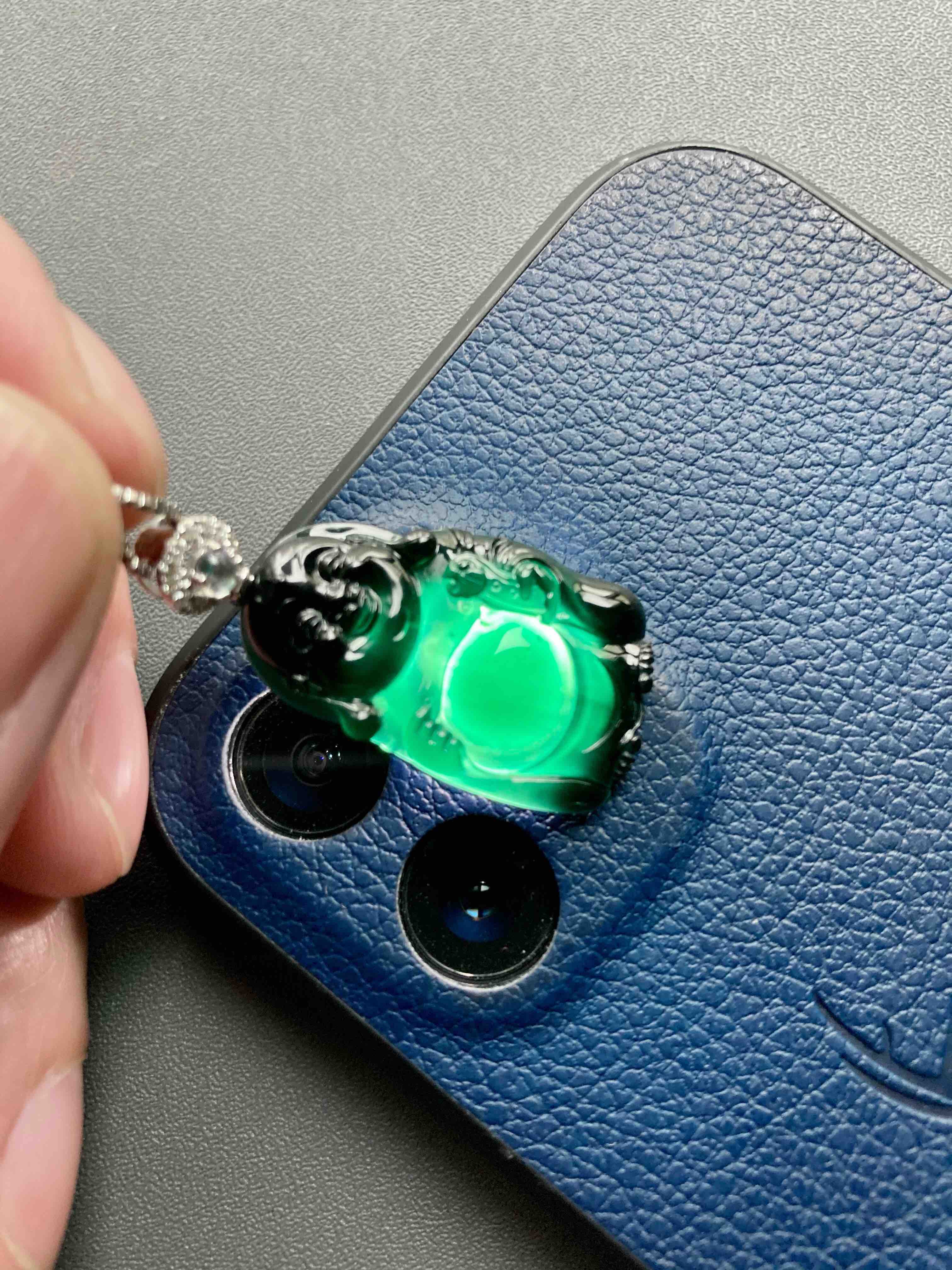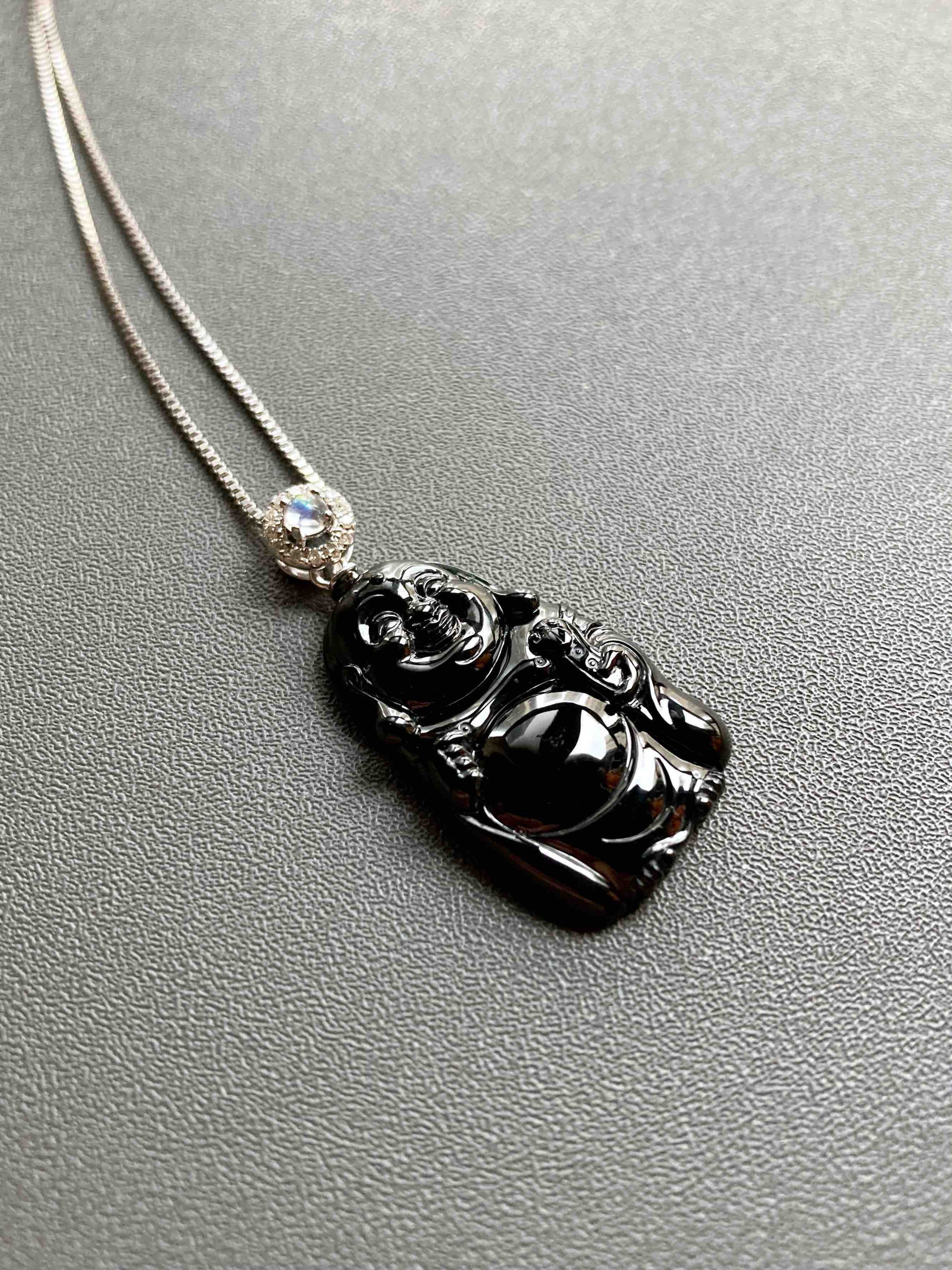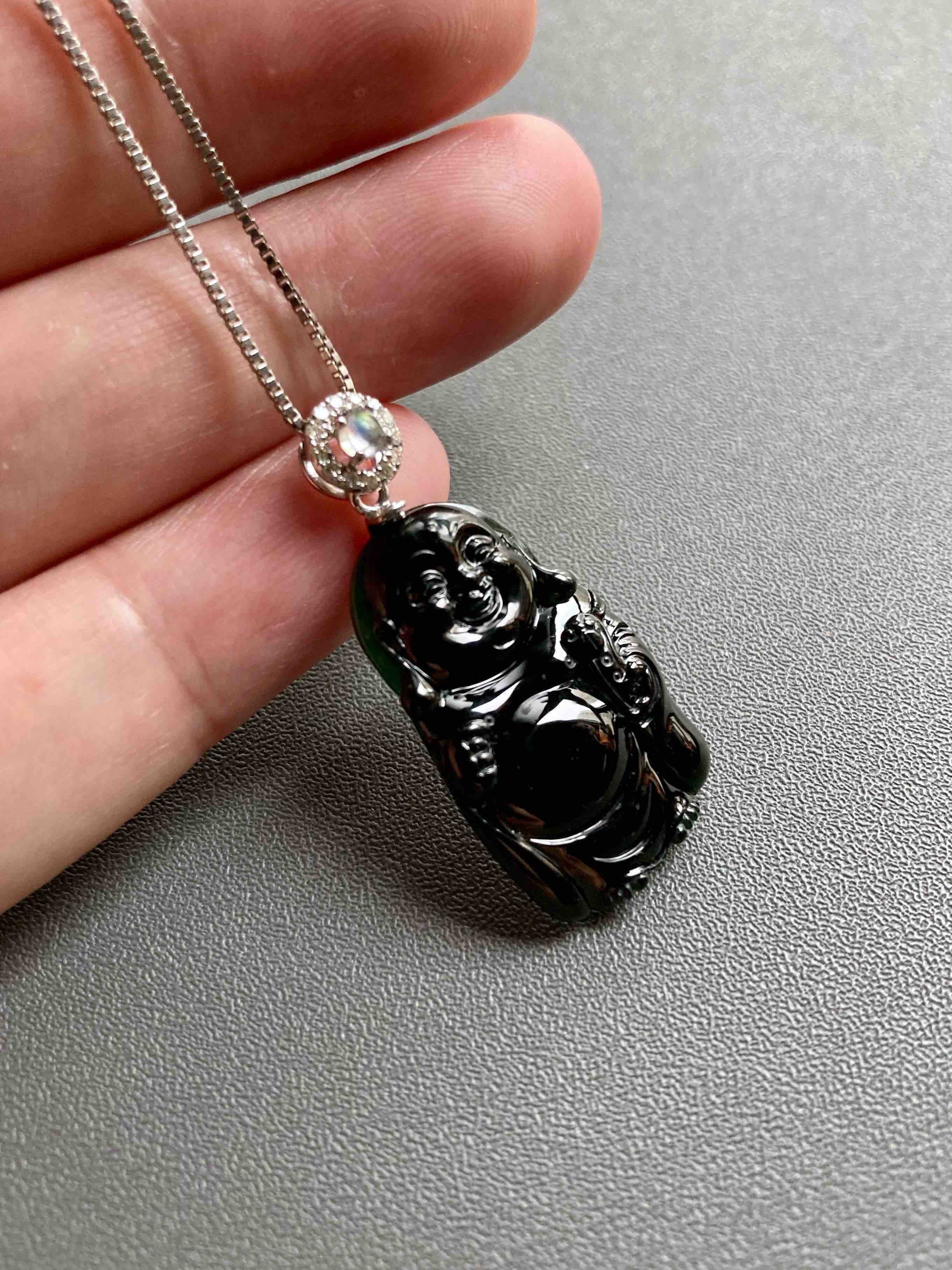 高冰种墨翠弥勒佛逍遥佛,26.5×16.4×4mm,镶嵌后34.1×16.4×.4mm,标本级的硬货,玩墨翠的必须收一个这样的,高冰种翡翠弥勒佛,从种水到雕刻,纯粹的美感,打灯全绿,通透无比,这品质的东西不容易,高性价比,18k白金钻石镶嵌变彩月光石扣头,两个字——精品