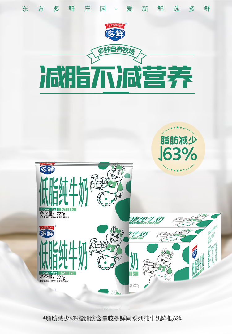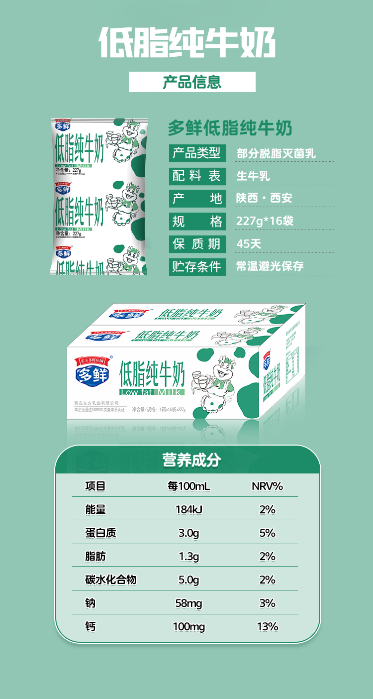 利乐枕低脂纯牛奶227g*16袋
