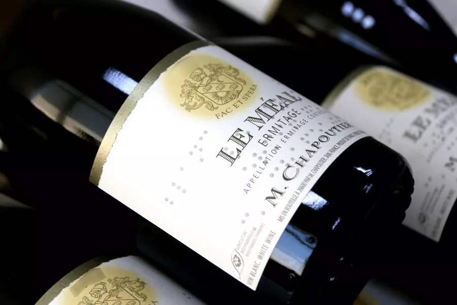 除了木箱和蜡封,酒标上还有独特的盲文,这是莎普蒂尔特地纪念一位老年失明的葡萄种植农,既表明了酒庄的人文关怀,也带来庄重的视觉美感。