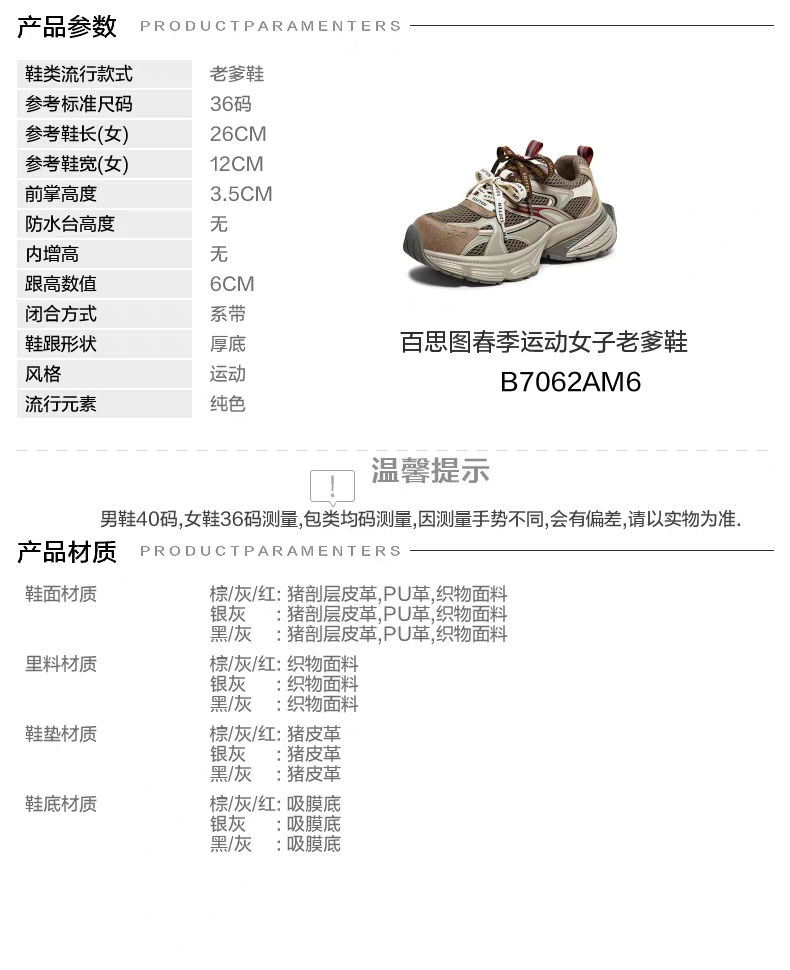 【云粉节】BF百思图2026春季新款网面透气老爹鞋厚底增高女运动休闲鞋B7062AM6吊牌价999.现价500