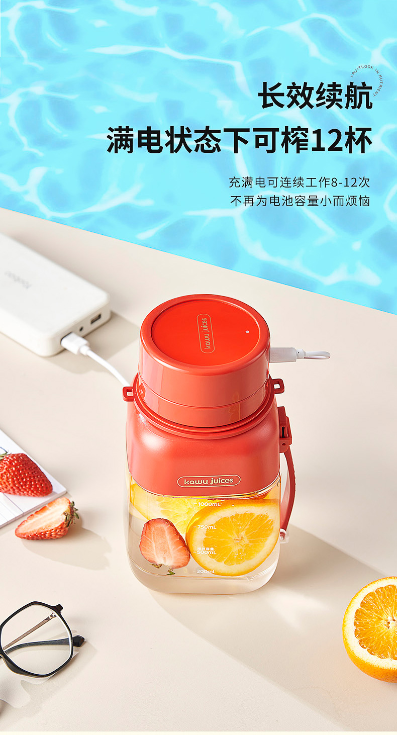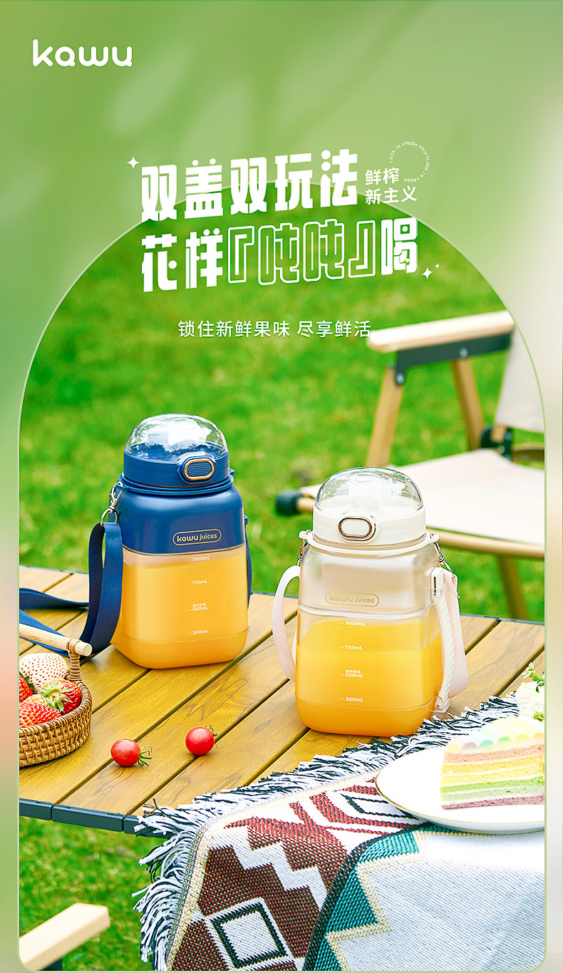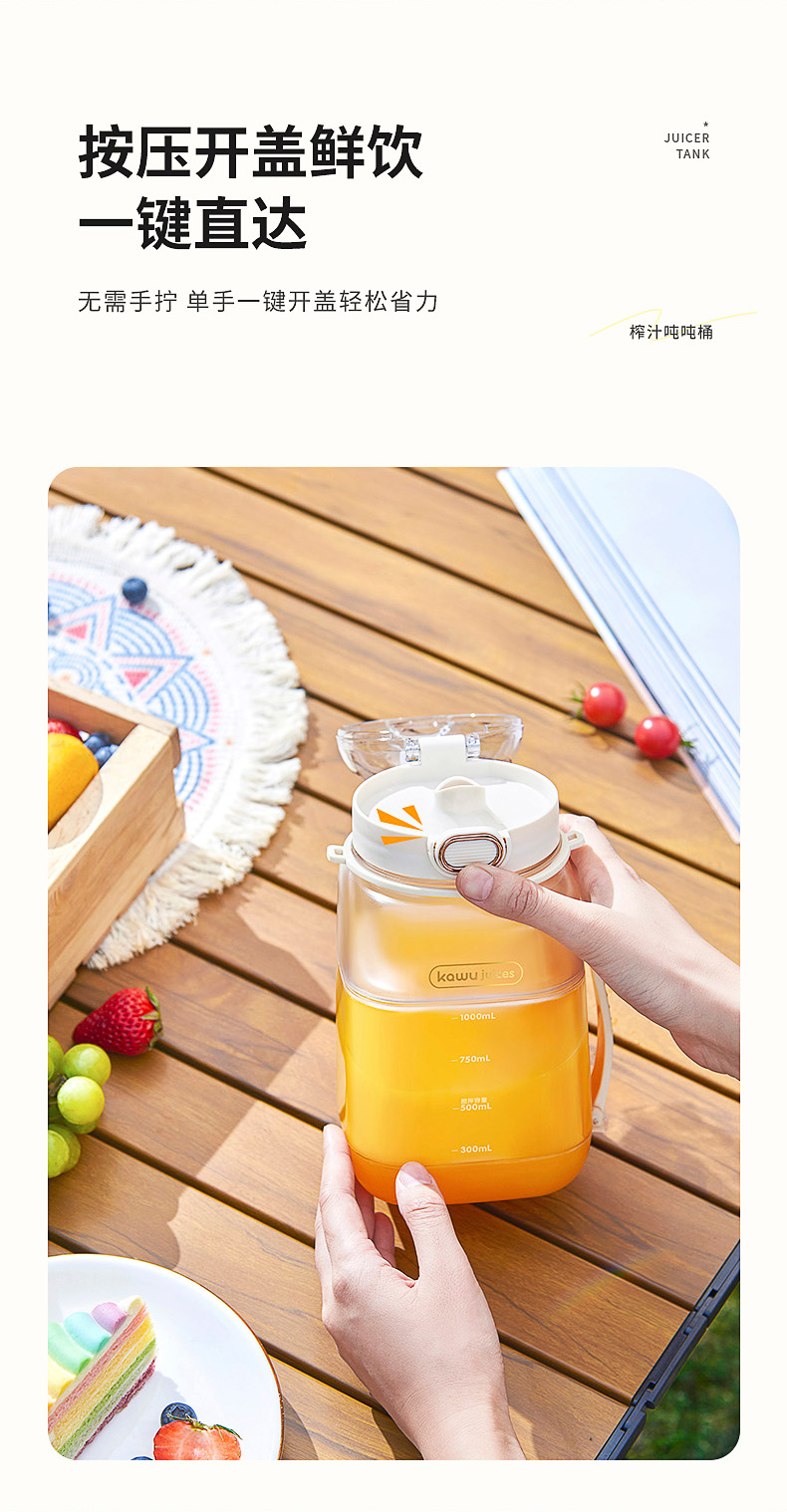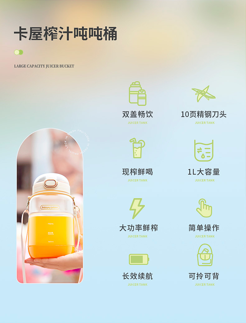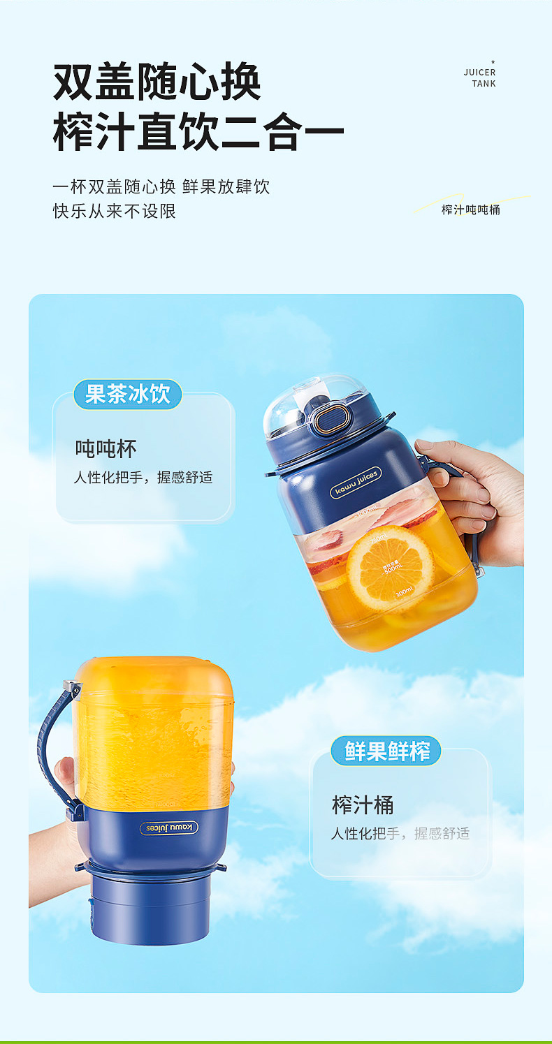 「1年质保 赠肩带」卡屋 便携式吨吨榨汁桶 可碎冰 一机双盖 便携出行 1L大容量 HAY-8302