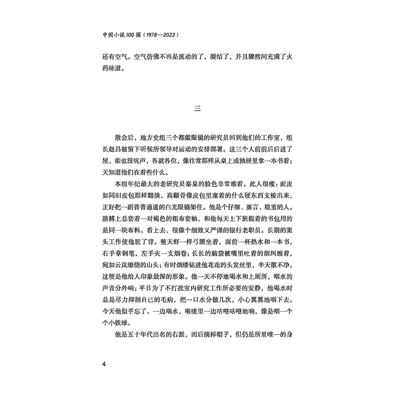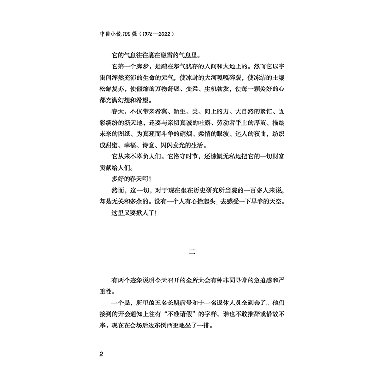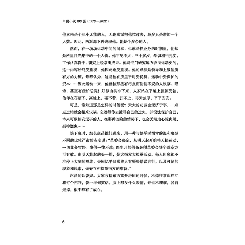【前言】;中国小说 100强(1978一2022)是资深出版人张明先生和腾讯读书知名记者张英先生共同策划发起的一套大型文学丛书。他们邀请我和宗仁发谢有顺、顾建平、文欢一起组成编委会,并特邀徐晨亮参与,经过认真研讨和多轮投票最终评定了 100 人的入选小说家目录。由于编委们大多都是长期在中国文学现场与中国文学一路同行的一线编辑、出版家、评论家和文学记者,可以说都是最专业的文学读者,因此,本套书对专业性的迫求是理所当然的,编委们的个人趣味、审美爱好虽有不同,但对作家和文学本身的尊重.对小说艺术的尊重、对文学史和阅读史的尊重,决定了丛书编选的原则、方向和基本逻辑。从文学史的角度来说,1978 年以后开启的新时期文学是中国当代文学的黄金时代,不仅涌现了一批至今享誉世界的优秀作家,而且创造了许多脍卖人口的文学经典,并某种程度上改写了 20 世纪中国文学史的版图。而在中国新时期文学的经典家族中,小说和小说家无疑是艺术成就最高、影响力最大的部分。;中国小说 100 强(1978一2022)就是试图将这个时期的具有经典性的小说家和中国小说的经典之作完整、系统地筛选和呈现出来,并以此构成对新时期文学史的某种回顾与重读、观察与评判。呈现在读者面前的这套丛书是对 1978一2022 年间中国当代小说发展历程的一次全面、系统的整体性回顾与检阅,是中国当代文学经典化的重要成果,从特定的角度集中展示了中国新时期文学在小说创作方面的巨大成就。需要说明的是,与 1978一2022 年新时期文学繁荣兴盛的局面相比,100 位作家和 100本书还远远不能涵盖中国当代小说的全貌,很多堪称经典的小说也许因为各种原因并未能进入。莫言、苏童、余华等作家本来都在编委投票评定的名单里,但因为他们已与某些出版社签下了专有出版合同,不允许其他出版社另出小说集,因而只能因不可抗原因而制爱,遗珠之憾实难避免,而且文学的审美本身也是多元的,我们的判断、评价、选择也许与有些读者的认知和判断是冲突的,但我们绝无把自己的标准强加于别人的意思。我们呈现的只是我们观察中国这个时期当代小说的一个角度、一种标准,我们坚持文学性、学术性、专业性民间性,注重作家个体的生活体验、叙事能力和艺术功力,我们突破代际局限,老、中、青小说家都平等对待,王蒙、冯骥才、梁晓声、铁凝、阿来等名家名作蔚为大观,徐则臣、阿乙、七舟、鲁敏、林森等新人新作也是目不暇接,我们特别关注文学的新生力量,尤其是近 10 年作品多次获国家大奖市场人气爆棚的新生代小说家,我们禀持包容、开放、多元的审美立场,无论是专注用现实题材传达个人迥异驳杂人生经验、用心用情书写和表现时代精神的现实主义作家,还是执着于艺术探索和个体风格的实验性作家,在从书里都是一视同仁。我们坚信我们是忠实于自己的艺术理想、艺术原则和艺术良心的,但我们并不认为自己的角度和标准是唯一的,我们期待并尊重各种各样的观察角度和文学判断。当然,编选和出版;中国小说 100 强(1978_2022)这套大型丛书,除了上述对文学史、小说史成就的整体呈现这一追求之外,我们还有更深远更宏大的学术目标,那就是全力推进中国当代文学;经典化的历程和;全民阅读书香中国建设。