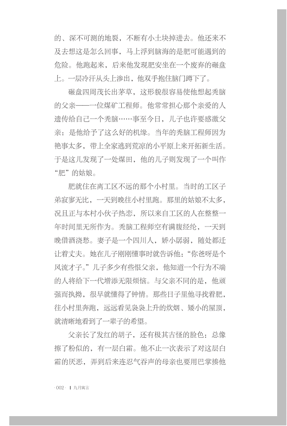 《九月寓言》是作者的巅峰之作,该书入选;新中国70年70部长篇小说典藏。书中描写一群人不停地行走,不断地寻找,他们看似漫无目的,却又一次次地拒绝,拒绝着生命可承受的轻与不可承受的重,莫名而又固执地拒绝着一切,却始终有盏灯亮在遥远虚无得不可及的地方,他们想在茫茫的黑暗中寻到哪怕是微渺的一丝光明。生命中的激越之爱、相濡之情便是这光与亮,让我们一路披荆斩棘一路平淡如水地走过。瞬间与永恒,凝固与流动,刹那间融为一体。这是一部寓言化了的历史、现实与未来,不啻为人类群体走向的最为生动与具体的诠释。