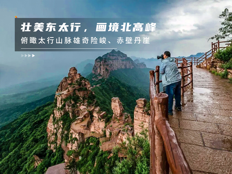 东太行高山栈道天境瀑布北高峰全景游:游览路线:游客中心-索道观光-南天门-四方桥-悬崖电梯-中天门-云际栈道-高山天瀑-天镜湖-天脊长城-九重天-北高峰-太行一柱-云端栈道-红象台-小羊山-索道下山-游客中心,我们深度体验媲美美国科罗拉多大峡谷的太行丹霞地貌风光,在云际栈道感受虚无缥缈的云海仙境,在云端漫步,逍遥自在旅行,心旷神怡。还可到国内最震撼最浪漫的东太行高山天瀑前“山盟海誓”,与TA或TA们鉴情,相伴一生,漫步云端!