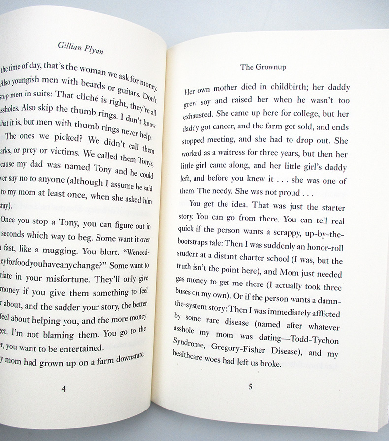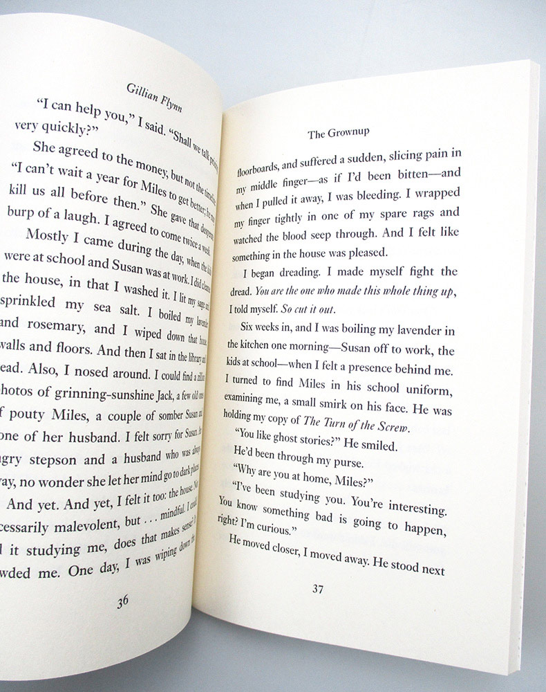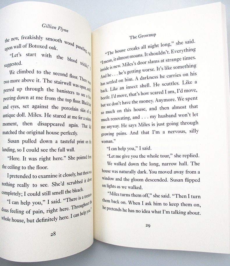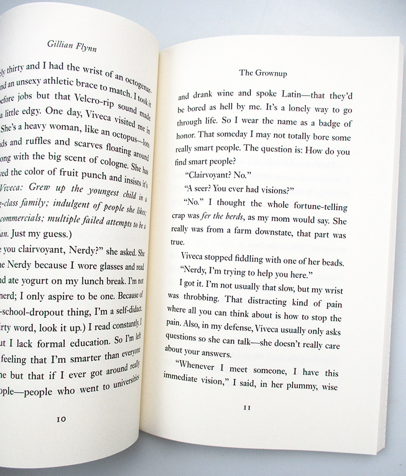 A young woman is making a living faking it as a cut-price psychic (with some illegal soft-core sex work on the side). She makes a decent wage mostly by telling people what they want to hear. But then she meets Susan Burke.Susan moved to the city one year ago with her husband and 15-year-old stepson Miles. They live in a Victorian house called Carterhook Manor. Susan has become convinced that some malevolent spirit is inhabiting their home. The young woman doesn't believe in exorcism or the supernatural. However when she enters the house for the first time, she begins to feel it too, as if the very house is watching her, waiting, biding its time . . .The Grownup, which originally appeared as 'What Do You Do?' in George R. R. Martin's Rogues anthology, proves once again that Gillian Flynn is one of the world's most original and skilled voices in fiction.