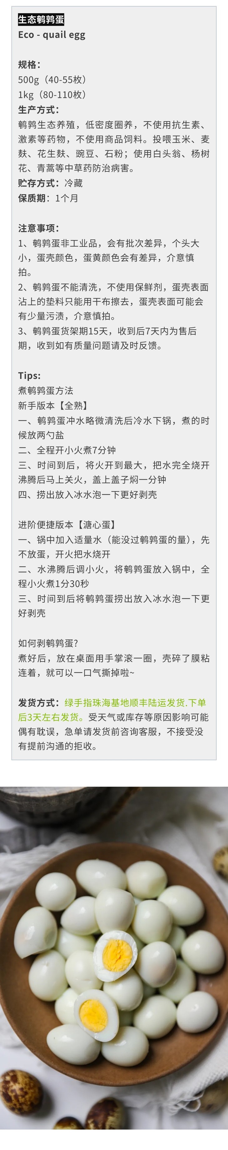 3、鹌鹑蛋货架期15天,收到后7天内为售后期,收到如有质量问题请及时反馈。