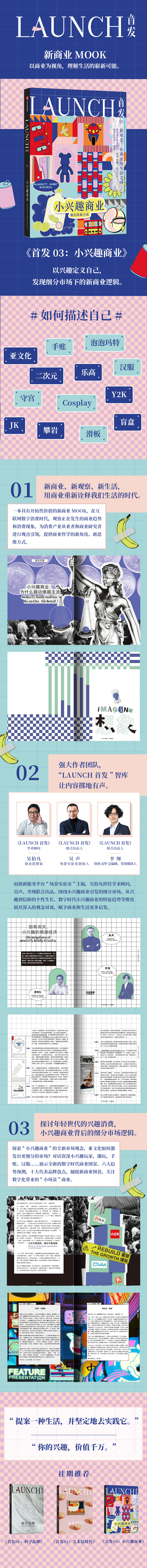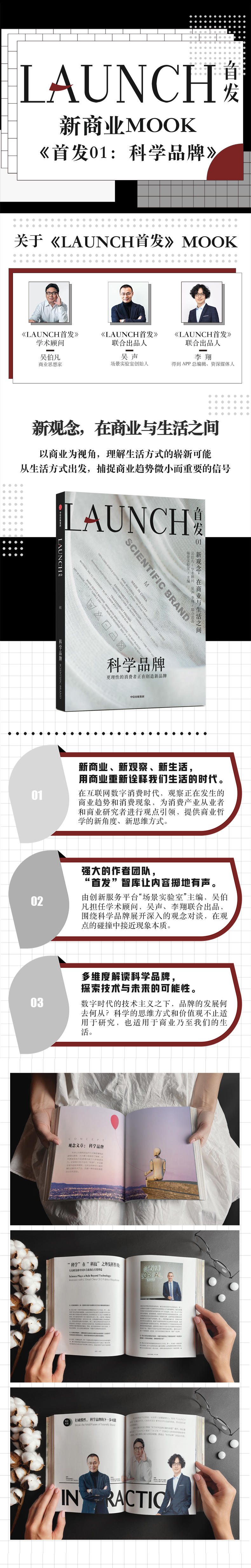《LAUNCH 发》是国内具有开拓性价值的观察新商业、新消费、新品牌、新生活的MOOK书。由吴声、李翔担任出品人,吴伯凡担任观念主理人和学术顾问。每期观察一个商业现象,从商业观念的更迭、新消费趋势的解读和消费品牌的塑造出发,触碰时代浪潮和生活的崭新可能。