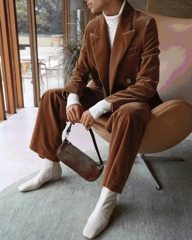 ○手抓感的拼接羊皮短靴与西装组合,颠覆了传统通勤装的刻板基因;