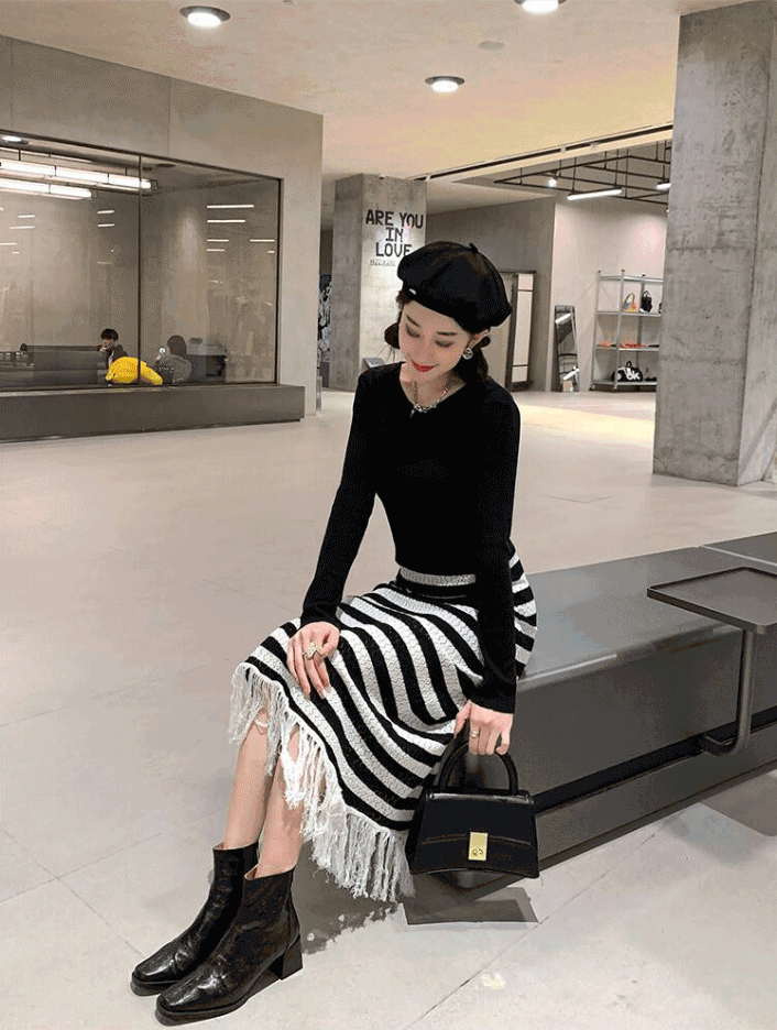 ○当利落的方头短靴碰撞柔软针织裙,是刚柔博弈间释放的摩登张力;