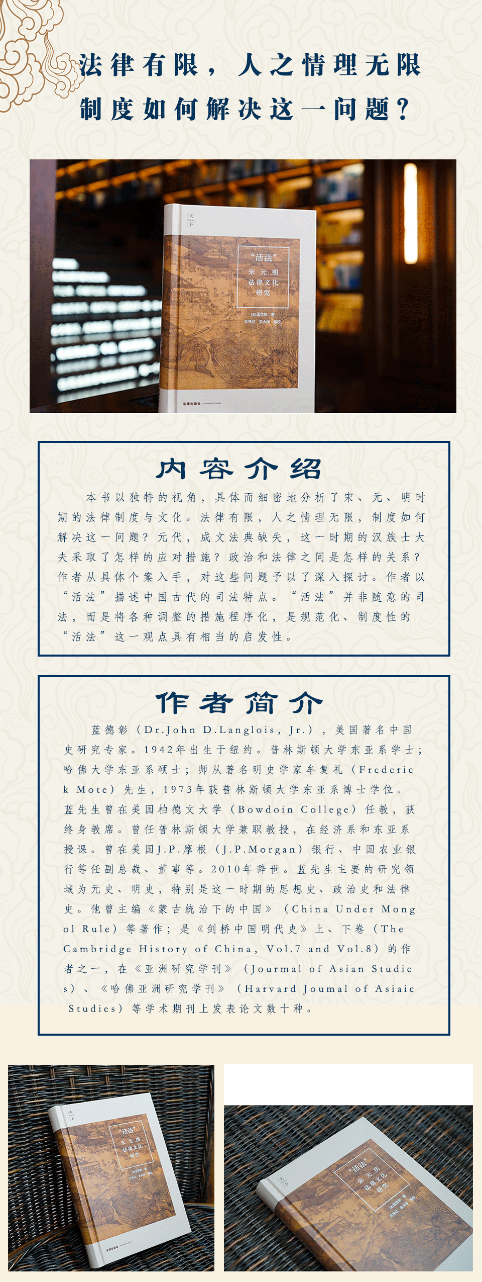 本书以独特的视角,具体而细密地分析了宋、元、明时期的法律制度与文化。法律有限,人之情理无限,制度如何解决这一问题?元代,成文法典缺失,这一时期的汉族士大夫采取了怎样的应对措施?政治和法律之间是怎样的关系?作者从具体个案入手,对这些问题予以了深入探讨。作者以“活法”描述中国古代的司法特点。“活法”并非随意的司法,而是将各种调整的措施程序化,是规范化、制度性的“活法”这一观点具有相当的启发性。