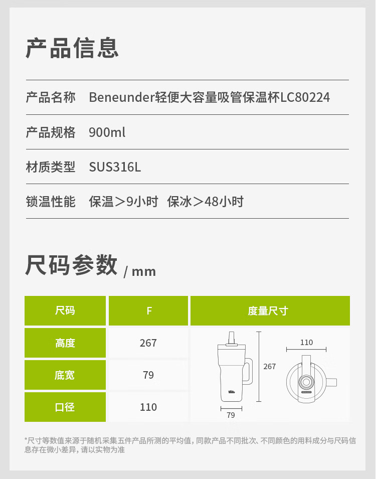 蕉下Beneunder轻便大容量吸管保温杯LC80224