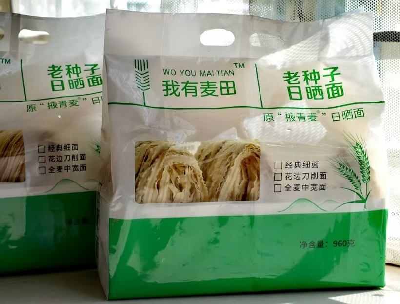【概况】这是一款“从麦田到餐桌”的日晒面,主理人是曾经的“北漂”,现在的“新农人”,他把在城市生活的感悟落实到田间地头,返乡种地,在内蒙古乌兰察布市的乡村承包了6000亩黑土地,坚持用“老种子”,坚持自然农法种植,种出了高能量的小麦;然后请专门的日晒面工厂生产,经过专业阳光房的日晒,手工盘面,加工过程中无任何其他添加成分参与,做出了纯粹、筋道、甘甜、有麦香的高品质日晒面。
