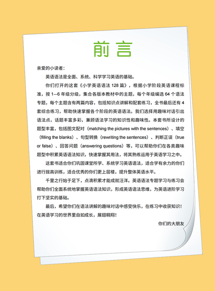 根据目前全国几大版本英语教材中一年级涉及的主题来编语法练习,所编练习注重一年级学生语言认知规律,题型丰富。除英语语法知识的讲解外,本书更注重语法在句子、对话、文章中的灵活运用,灵活多样的练习可提升学生的语法感知能力,在练习的过程中掌握语法规则。每个主题的练习注重考查同一知识点在不同题型的复现,训练语法的同时,也能让学生掌握某一主题下较全面的英语知识点。全书为全彩印刷,配图生动有趣,符合小学生的兴趣。