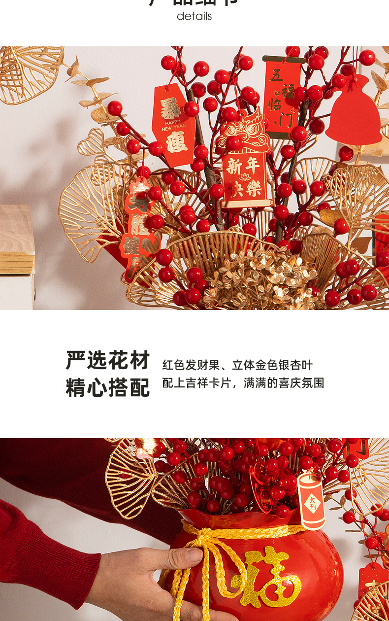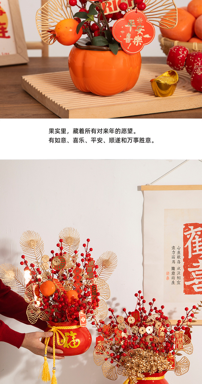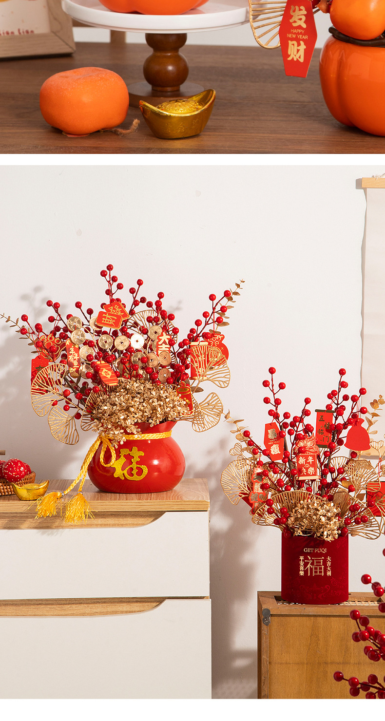 【送烫金吊牌 招财纳福花瓶套装】新年乔迁之喜发财果红果福桶摆件春节年宵花抱抱桶客厅装饰盆栽