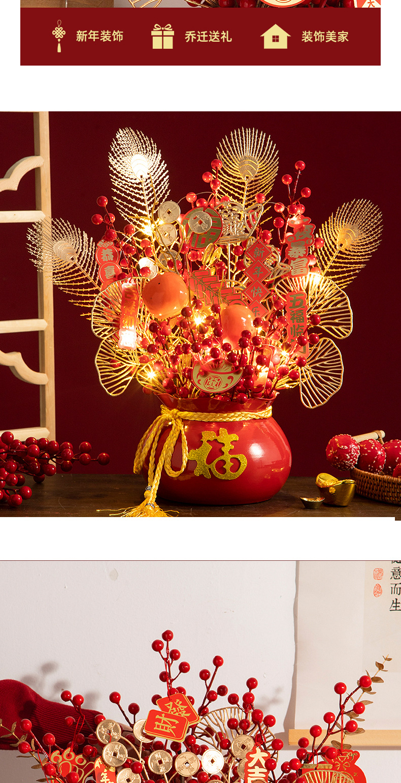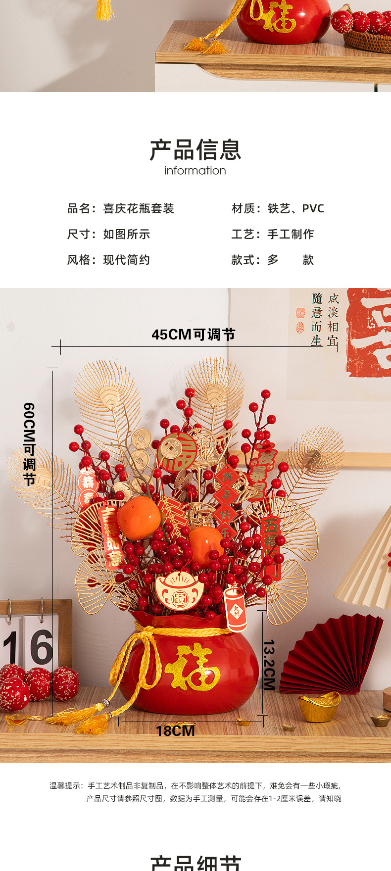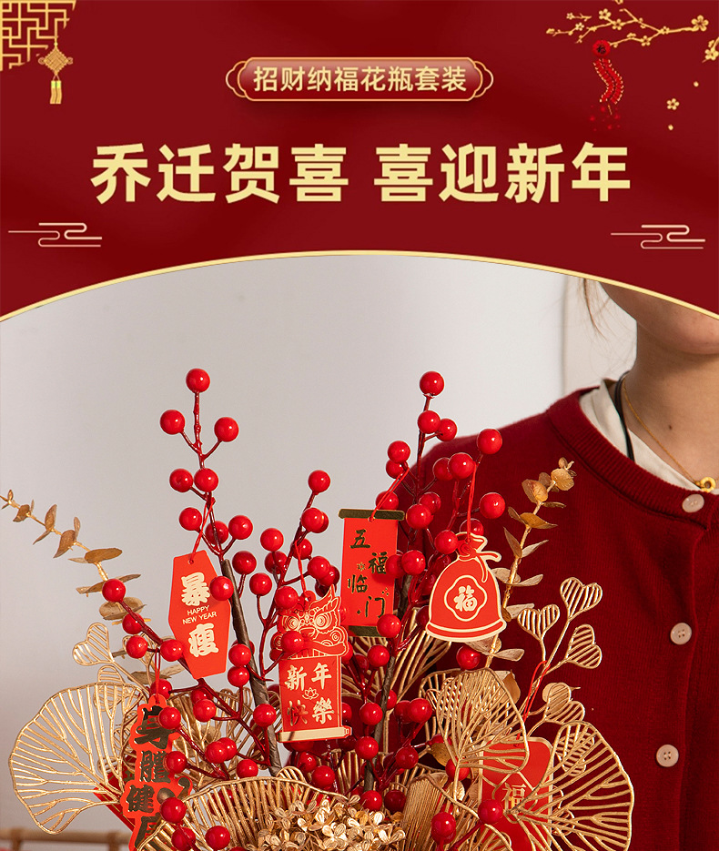【送烫金吊牌 招财纳福花瓶套装】新年乔迁之喜发财果红果福桶摆件春节年宵花抱抱桶客厅装饰盆栽