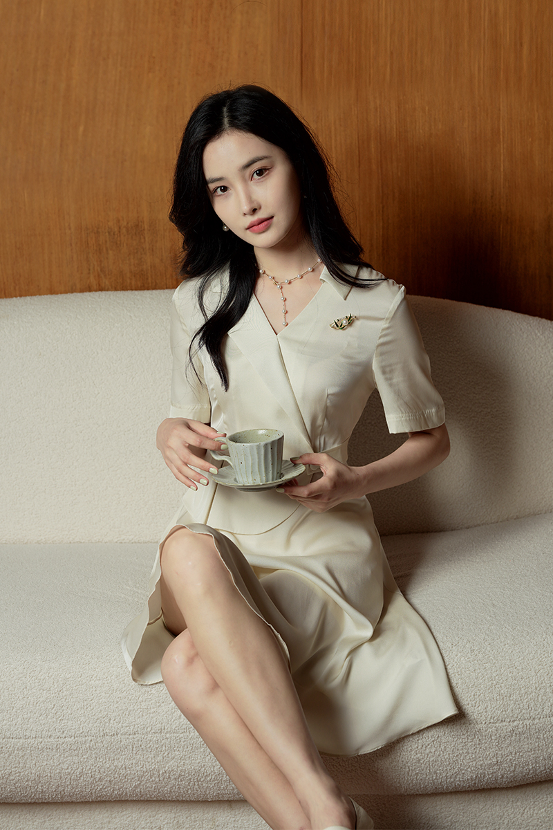 选自89.9%的桑蚕丝+10.1%的氨纶,桑蚕丝柔软无骨,有很好的透气性和悬垂性,垂坠感将衣身的流畅线条呈现,手感就像牛奶一般丝滑细腻,柔滑润泽,莹润的光泽,室内看着都非常显贵气,特别是在阳光下的质感更不趋于平淡。