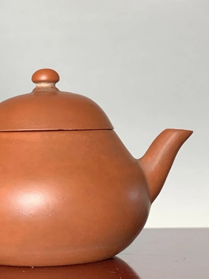 此梨形朱泥紫砂袖珍茶壶,设计新颖独特、风格隽永、做工精湛,用料讲究,除壶盖有一处非常微小磕痕外,保存完好无损。