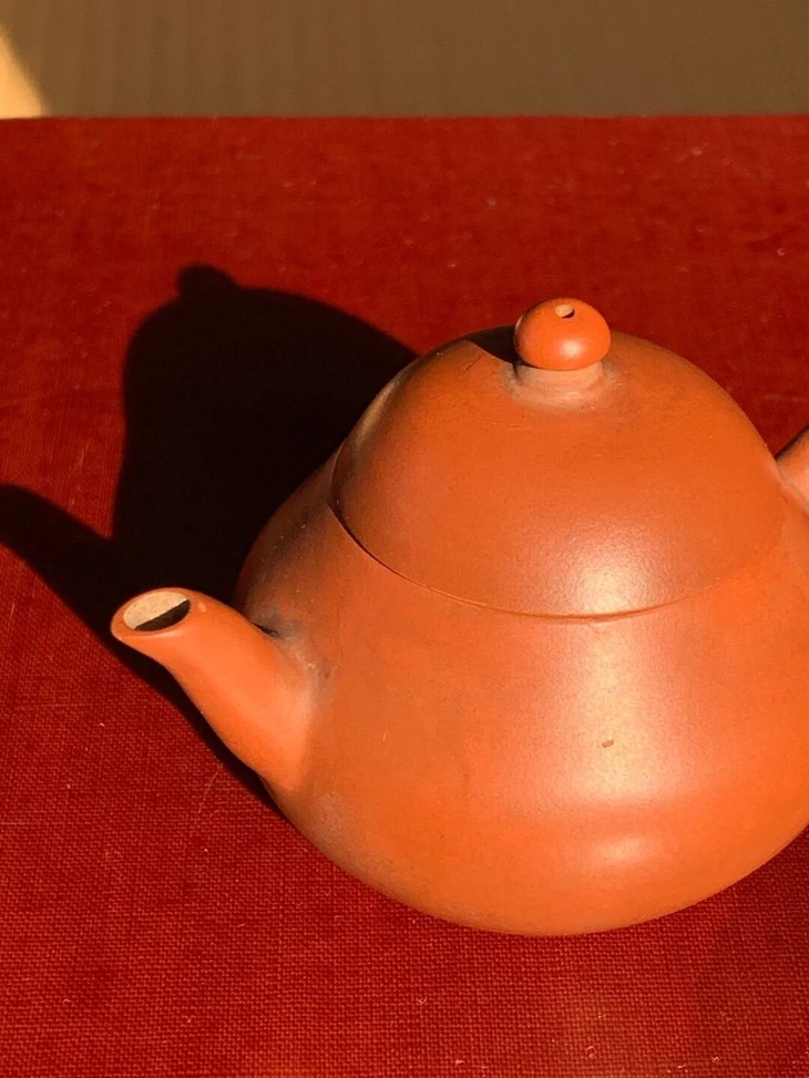 这是一件造型与用料特殊的老朱泥紫砂袖珍茶壶,梨子造型典雅大方,表面素面朱泥细腻、色泽柔美,此紫砂袖珍茶壶除用料精良、袖珍造型优美且作工精湛外,壶底落记年款“嘉慶年製”,在壶把底部下方袖珍工坊款:“如記”,这类容量低于一百毫升的袖珍紫砂茶壶是冲泡潮汕工夫茶或是日本煎茶模式所烧造的小茶壶,此只老紫砂壶具有收藏意义。