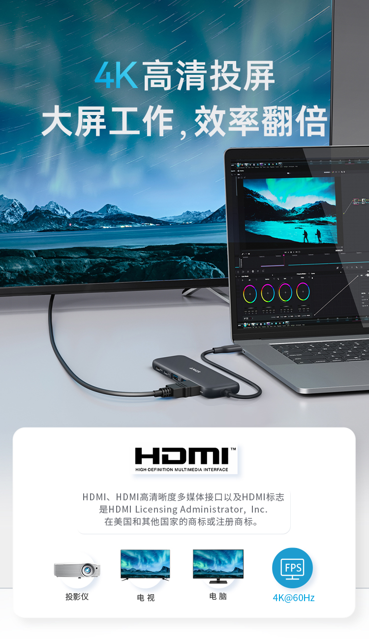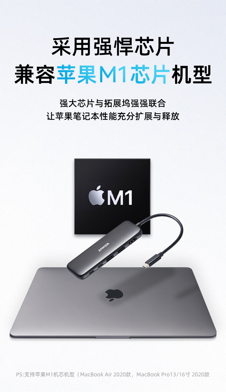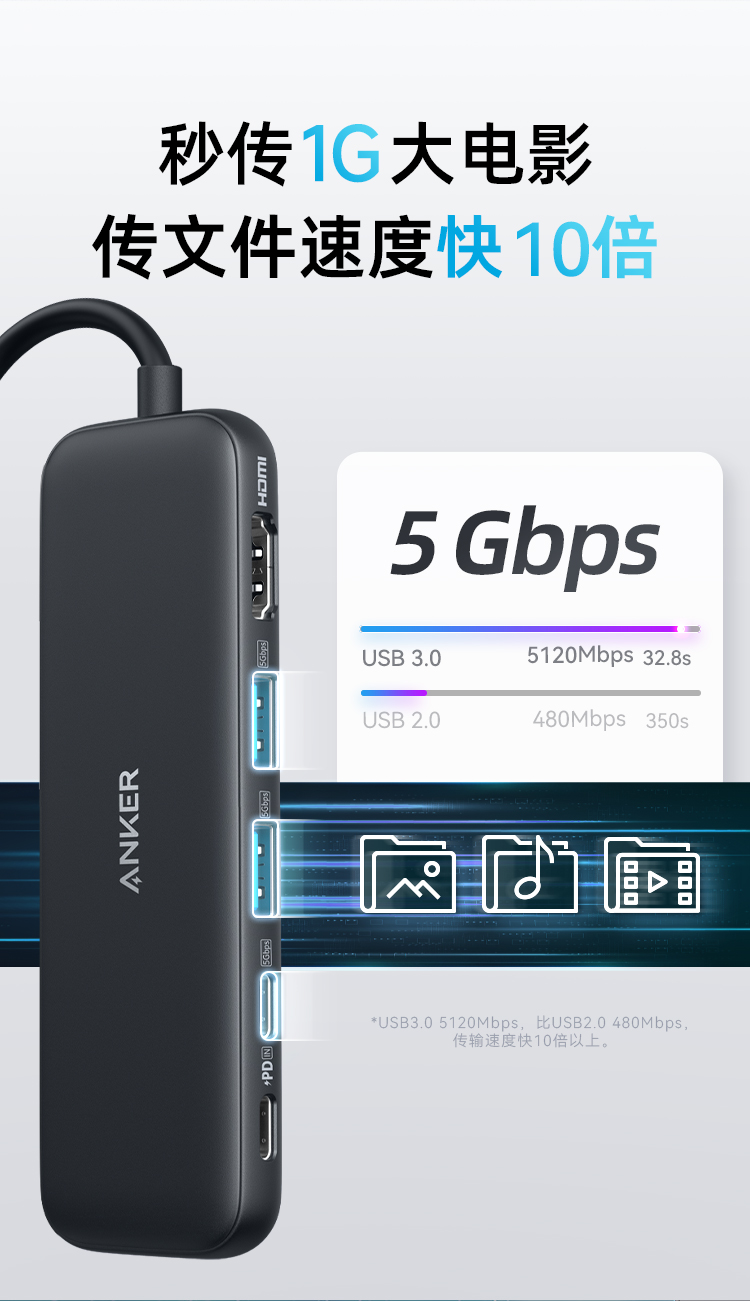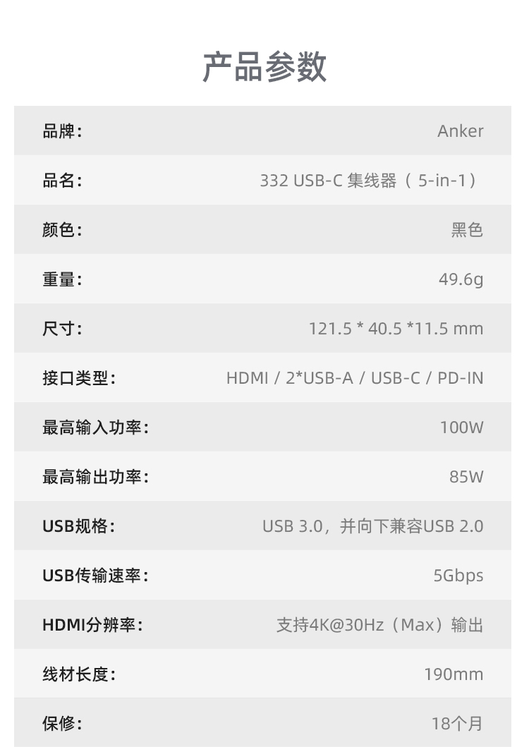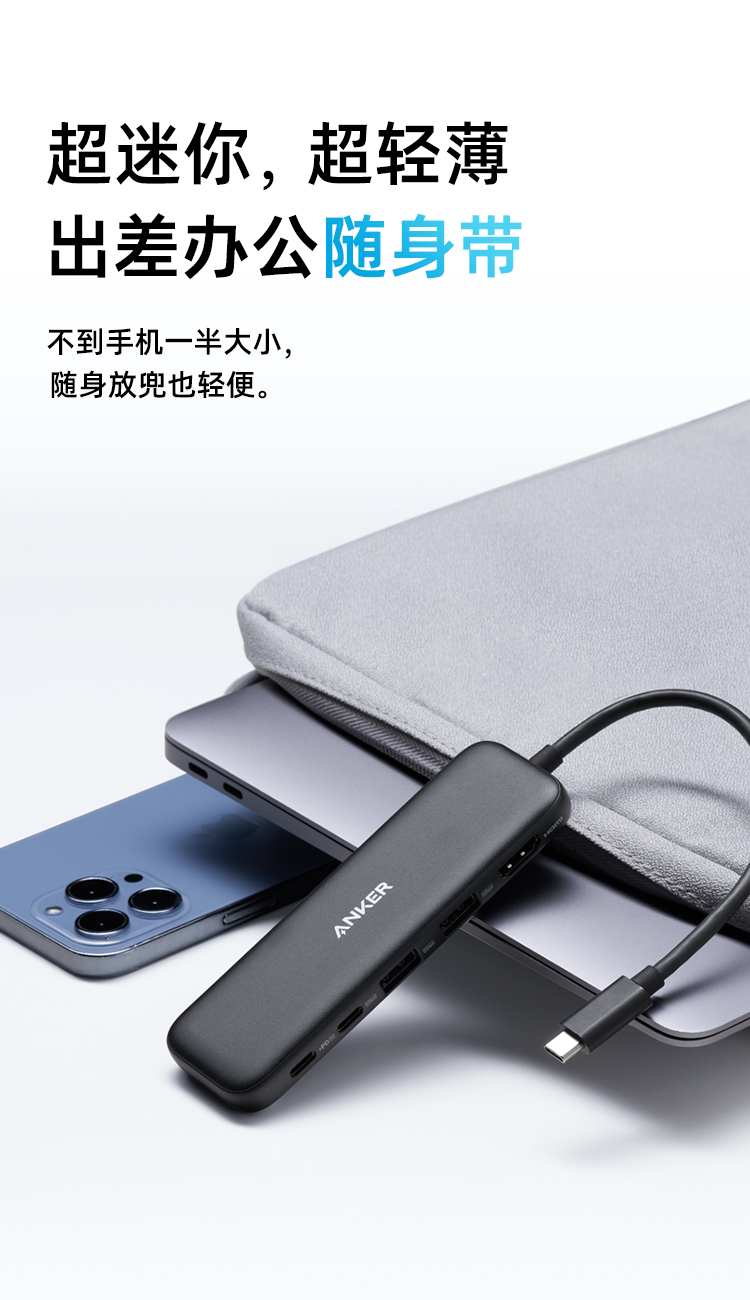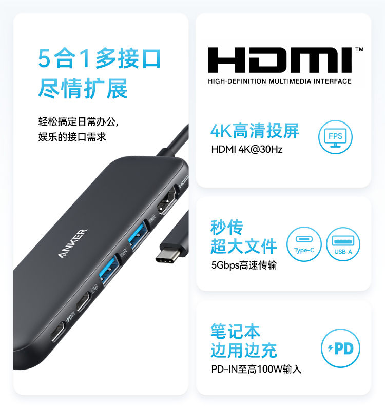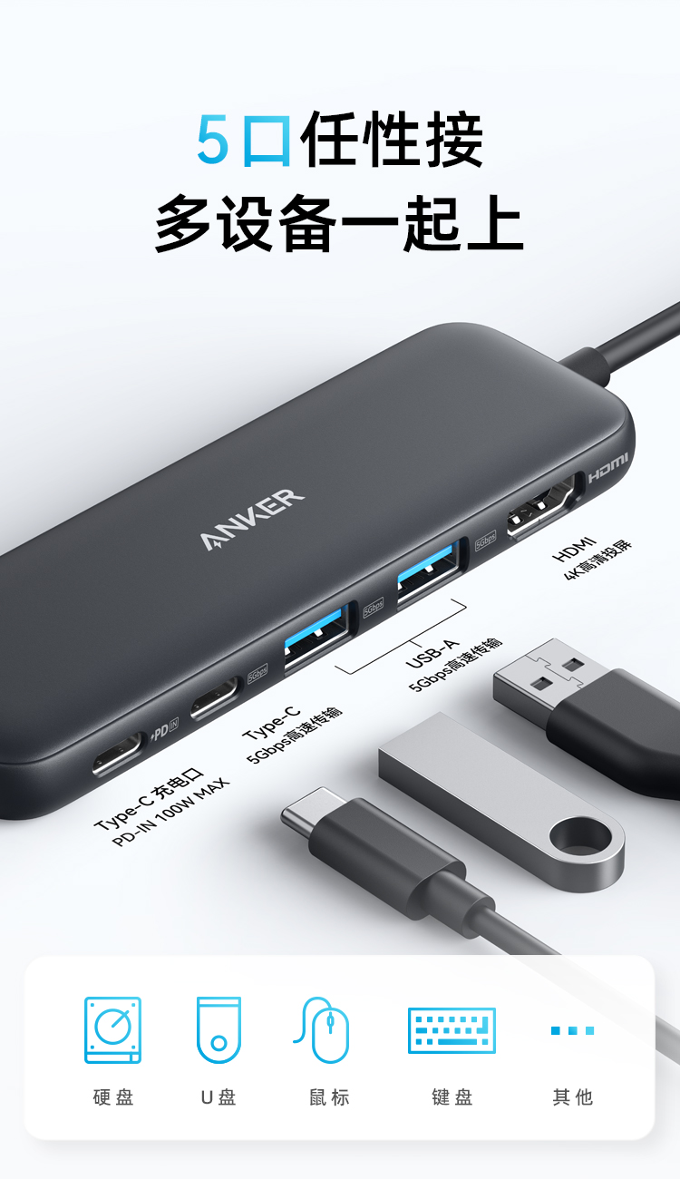 Anker安克 5合1 Type-C 多功能扩展坞 支持100W快充 适用笔记本电脑/手机 A8355