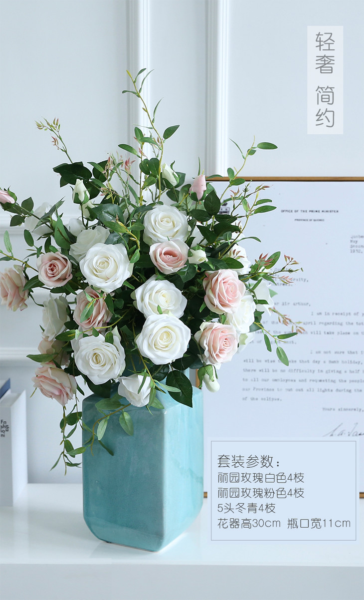 原野 玫瑰仿真花假花 高档酒店客厅装饰花陶瓷花瓶花艺摆件