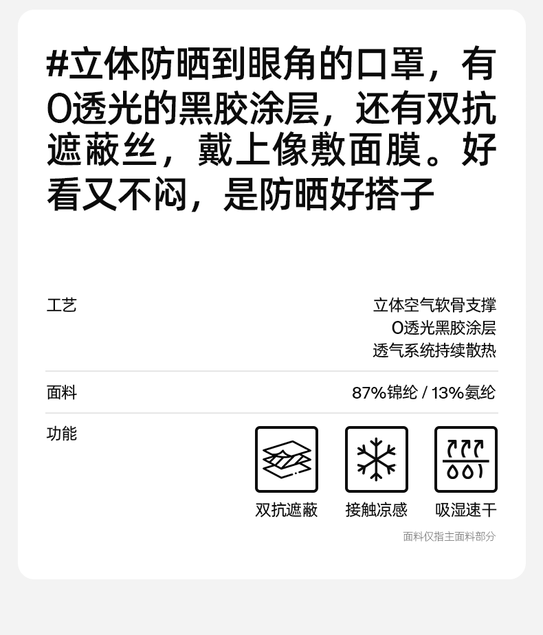 【69元选3个】【护眼角 不透光 不蹭口红 抗菌凉感 水洗防晒不减】小野和子 车缝款立体防晒口罩