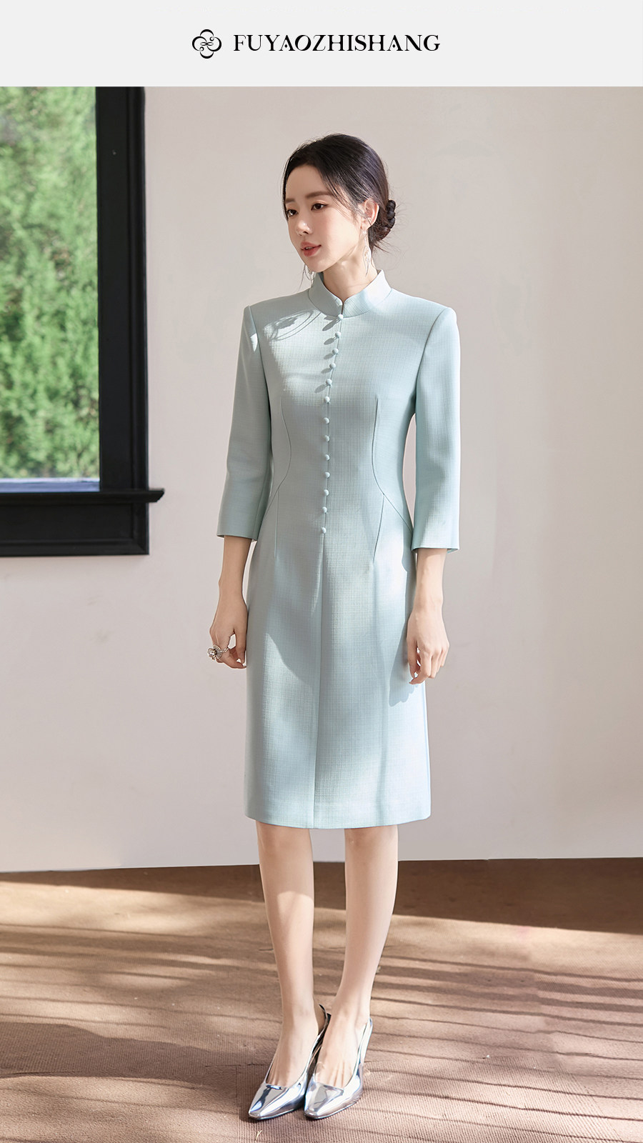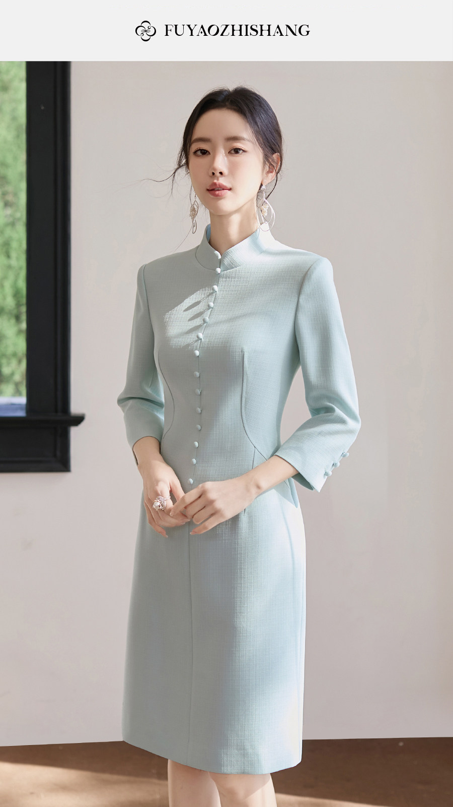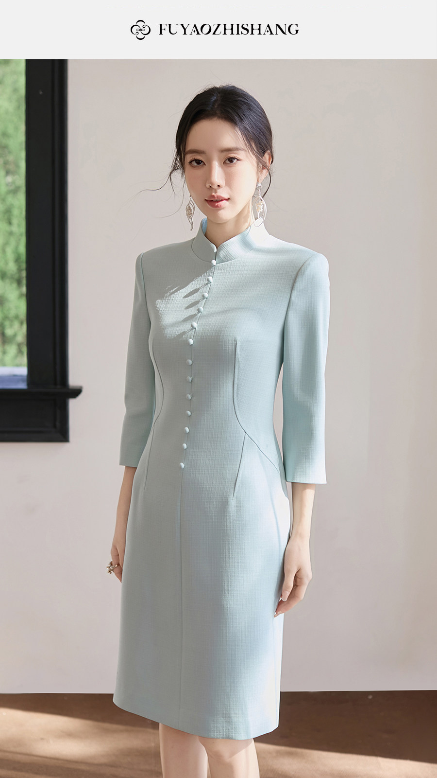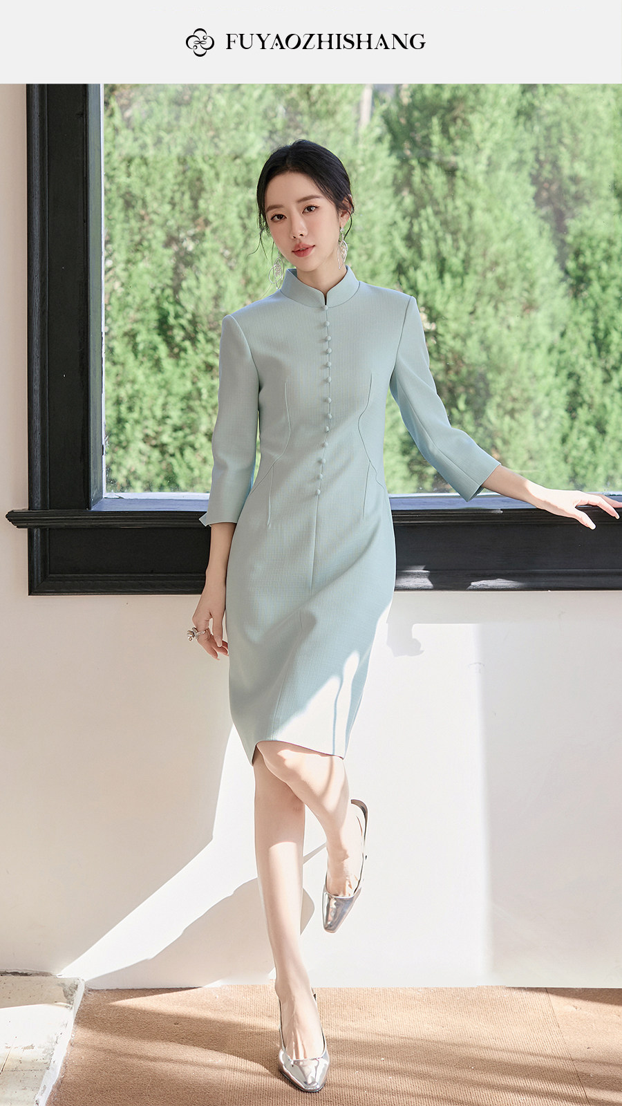 FUYAO扶摇直上 中式风立领连衣裙女修身水绿色醋酸旗袍裙优雅裙子