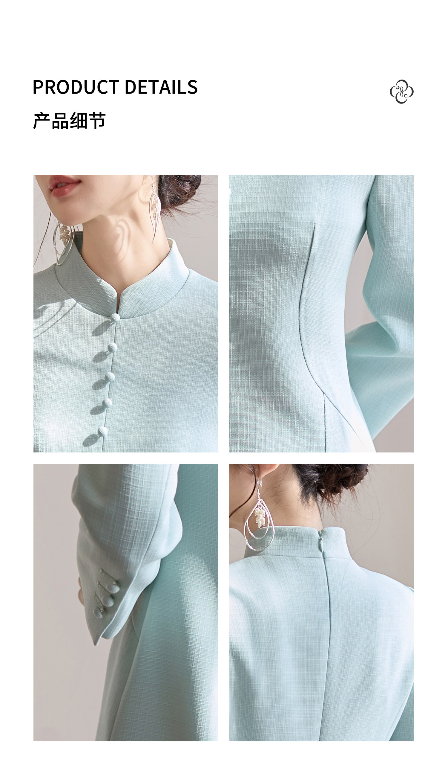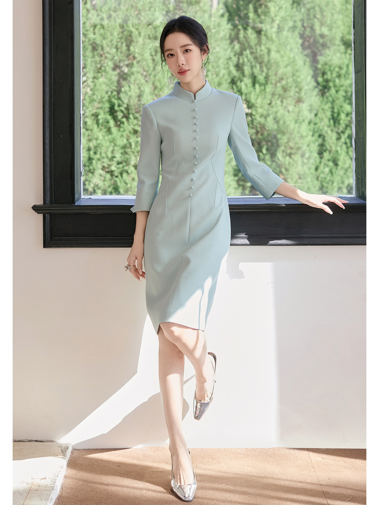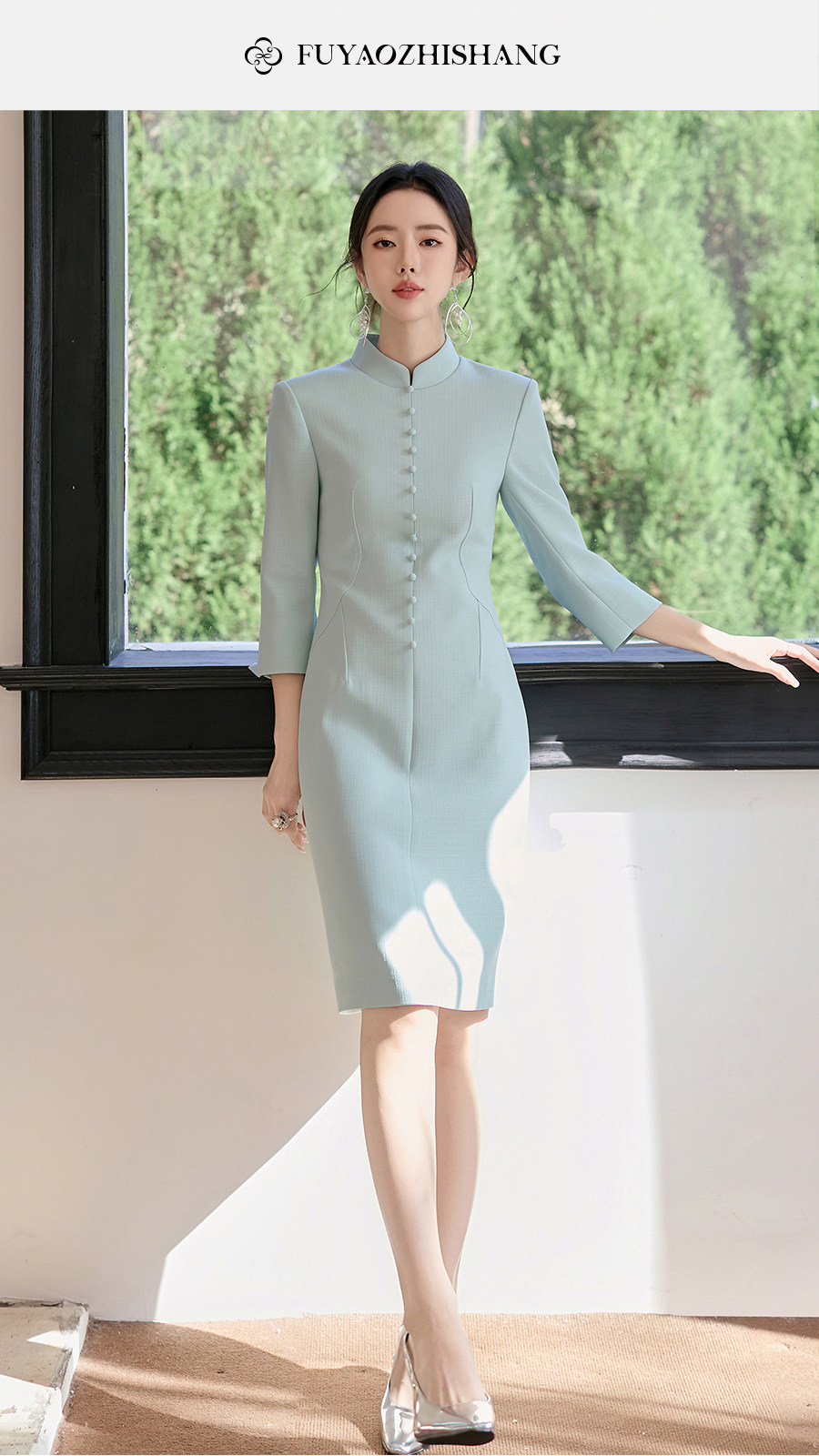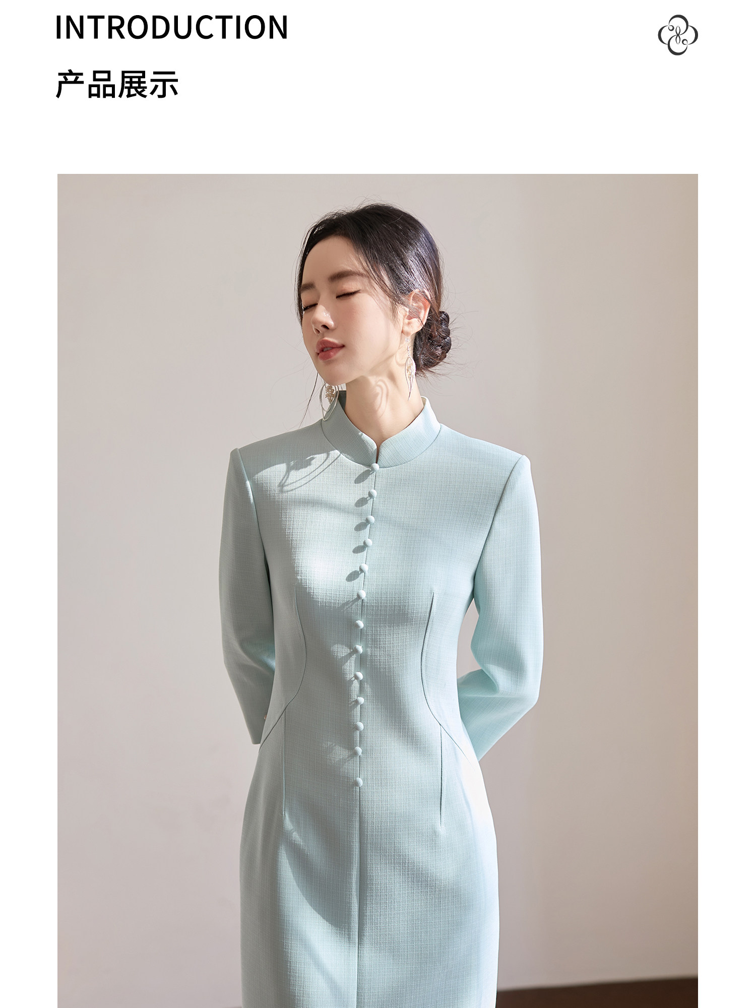FUYAO扶摇直上 中式风立领连衣裙女修身水绿色醋酸旗袍裙优雅裙子