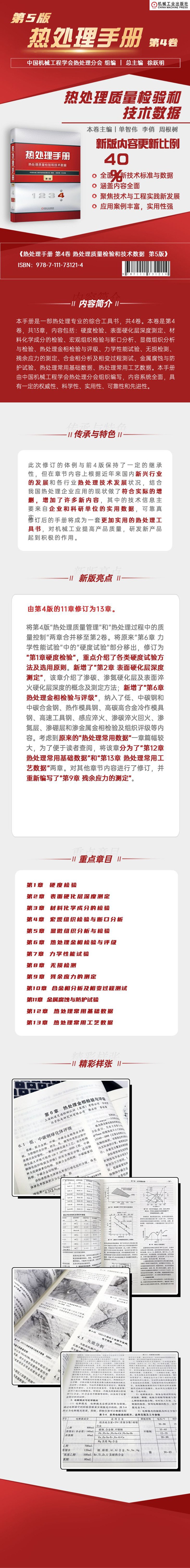 在第4版《热处理手册》出版的十几年间,国内外热处理技术飞速发展,涌现出许多先进技术、装备,以及全过程质量管理方法和要求,因此,亟须对《热处理手册》进行再次修订,删除陈旧过时的内容,补充先进典型技术,满足企业生产和行业技术发展的需要,切实发挥工具书的作用。鉴于此,中国机械工程学会热处理分会组织国内专家和学者自2020年5月起,按照实用性、系统性、先进性和高标准的原则开展修订工作,以求达到能正确指导生产、促进技术进步的目的。