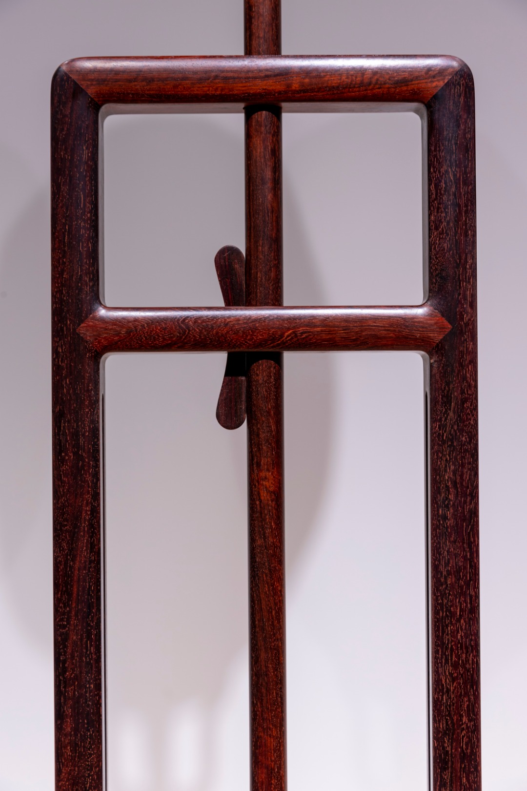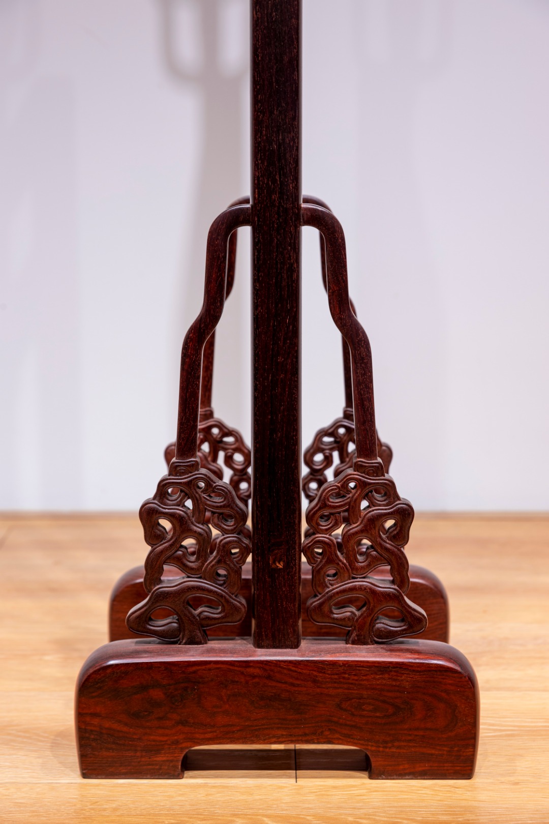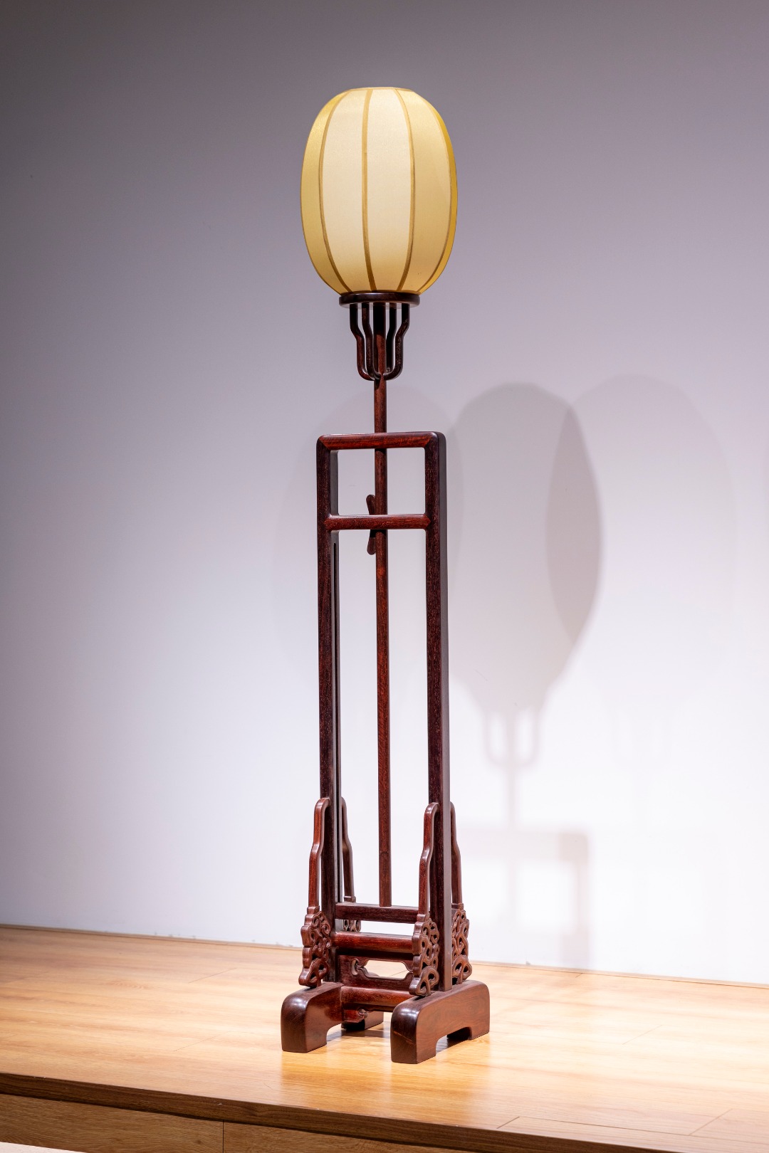 灯台底座用素墩木,质朴稳定;墩木上立柱两旁站牙,用灵芝蟠错成纹,设计绝妙,在传统家具纹饰形态中亦属少见。墩木间以横枨嵌夹透雕绦环板,颇似高束腰香几,所开之禹门洞形态。灯台赏面皆作素混,以手摩挲,可体验细磨功夫,转角处处倒圆。由灯罩、挂牙、灯杆、立柱、站牙,一路向下,比例协调,圆融至深。