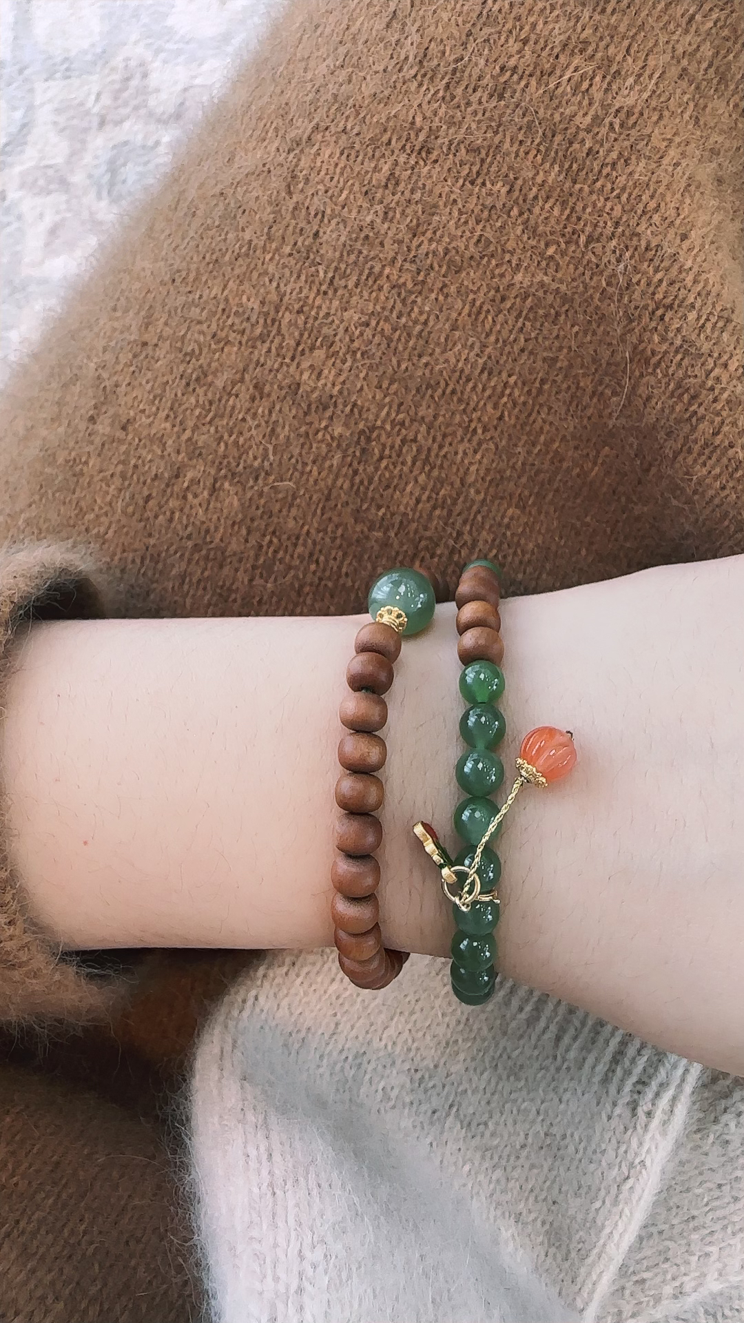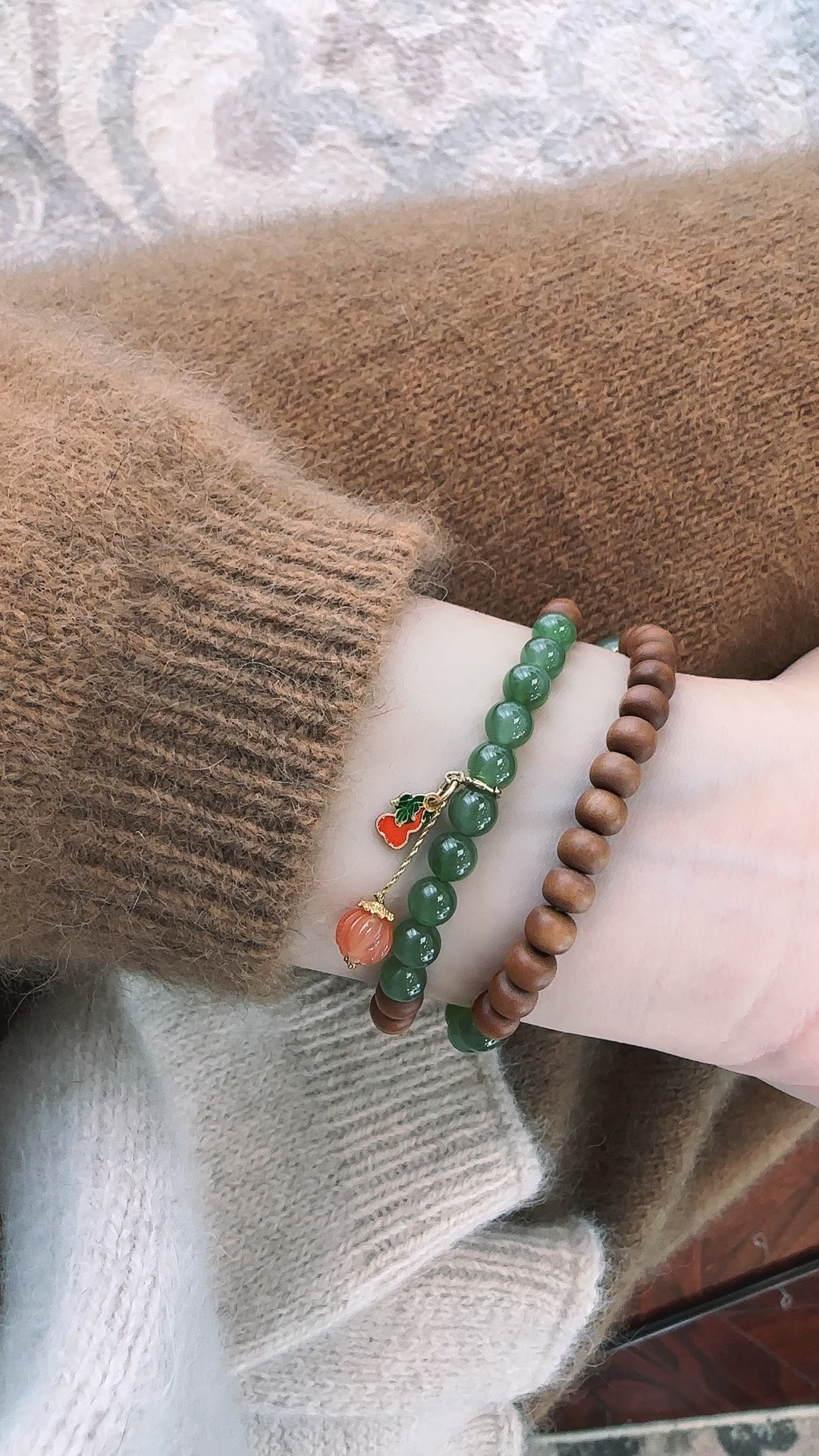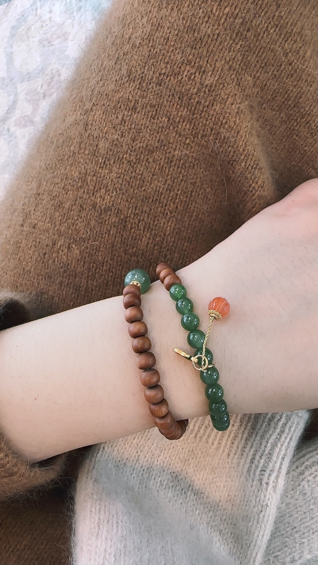 独家原创设计,碧玉搭配印度老山檀,一颗大颗粒碧玉圆珠(约9-9.5mm)两侧925纯银隔珠点缀,925纯银万能扣连接古法工艺烤漆小葫芦、冰飘南红莲花珠作坠(可随意拆卸调换位置),更添几分灵动之美,上身清新典雅,不挑年纪,日常佩戴简约百搭~