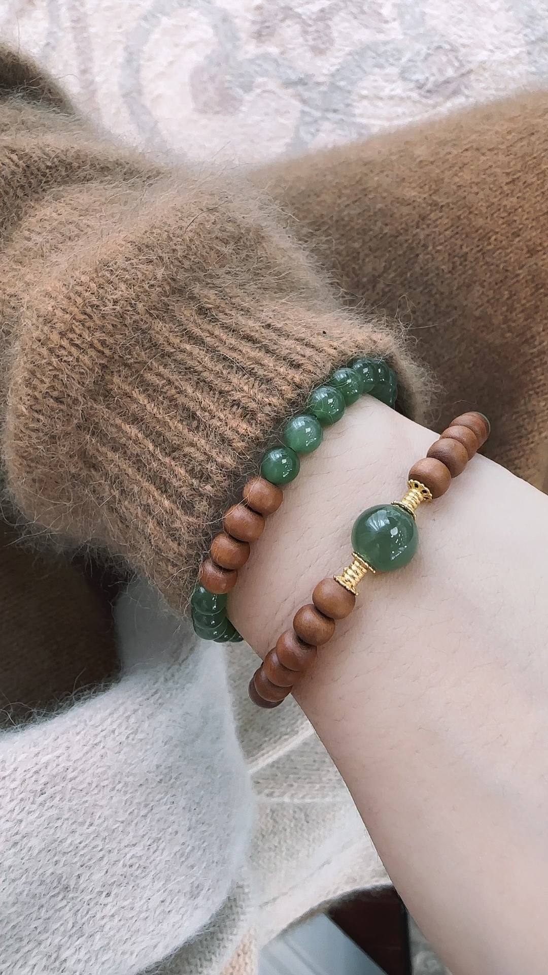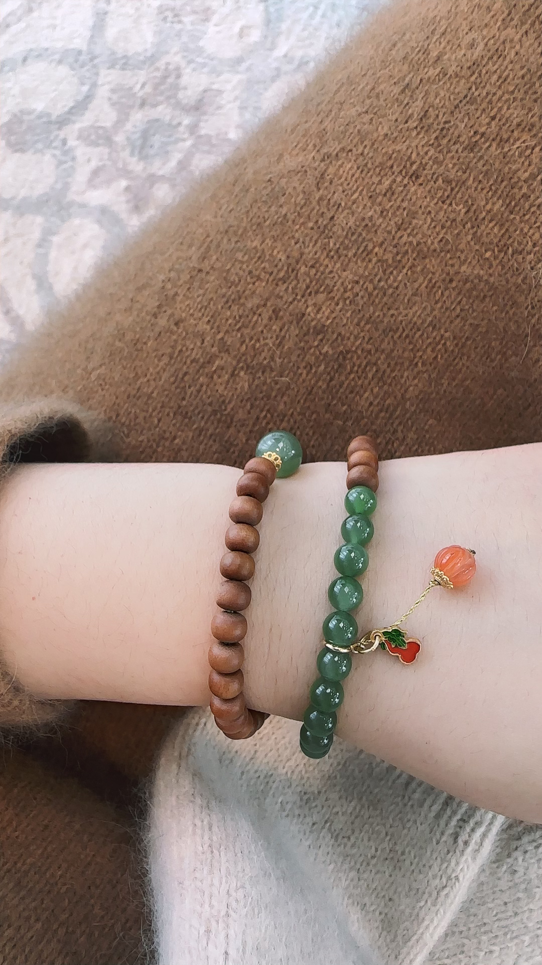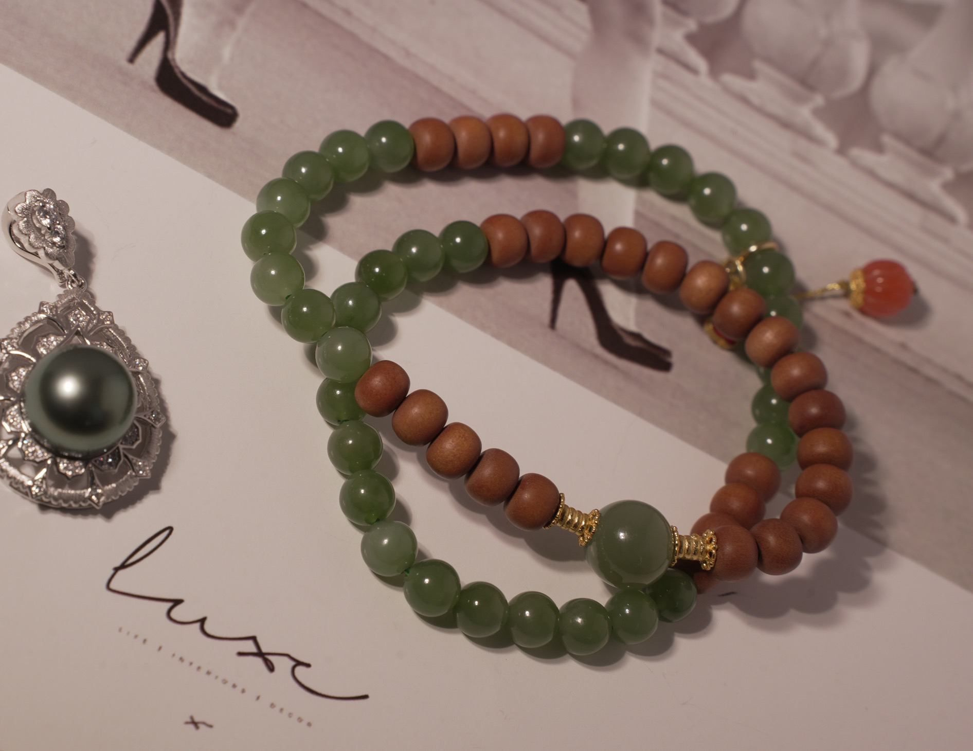 独家原创设计,碧玉搭配印度老山檀,一颗大颗粒碧玉圆珠(约9-9.5mm)两侧925纯银隔珠点缀,925纯银万能扣连接古法工艺烤漆小葫芦、冰飘南红莲花珠作坠(可随意拆卸调换位置),更添几分灵动之美,上身清新典雅,不挑年纪,日常佩戴简约百搭~