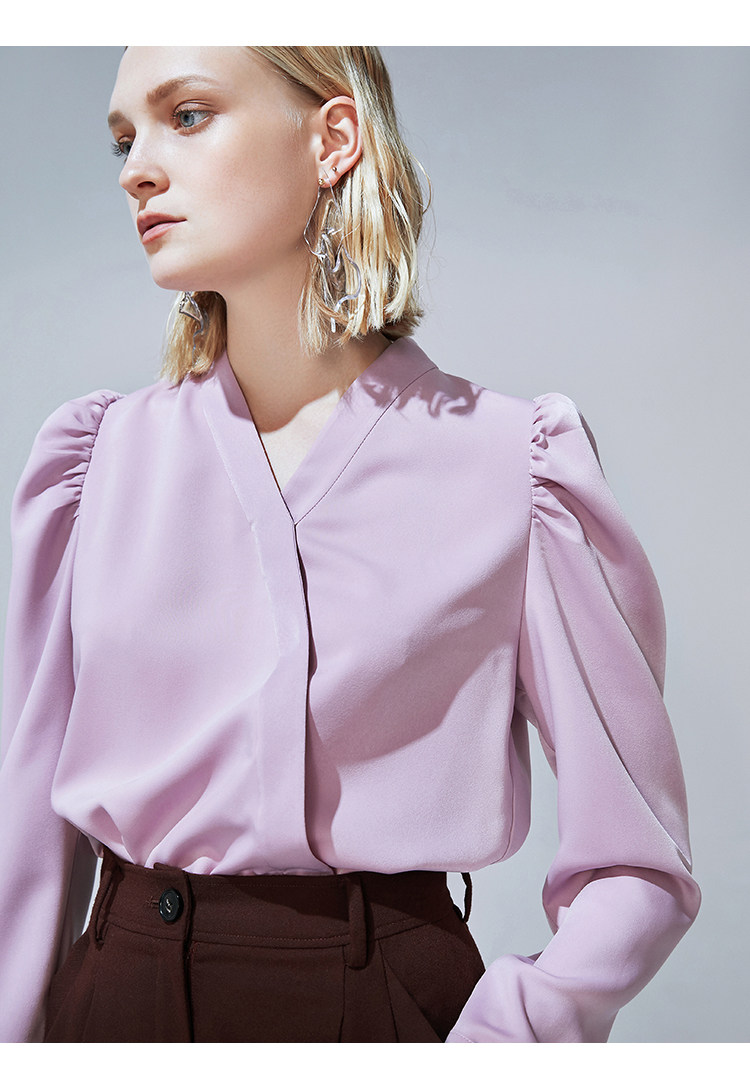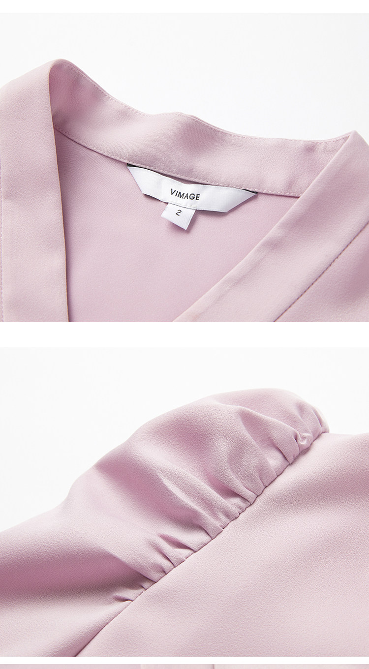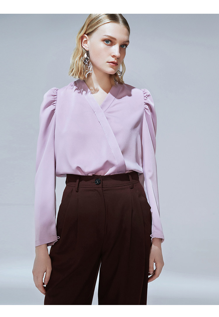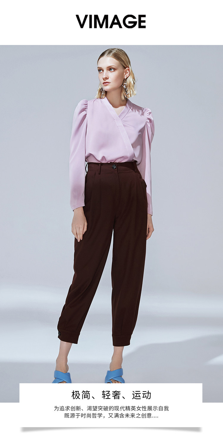 VIMAGE纬漫纪秋季新款时尚复古泡泡袖斜襟V领直筒显瘦上衣女V1413010